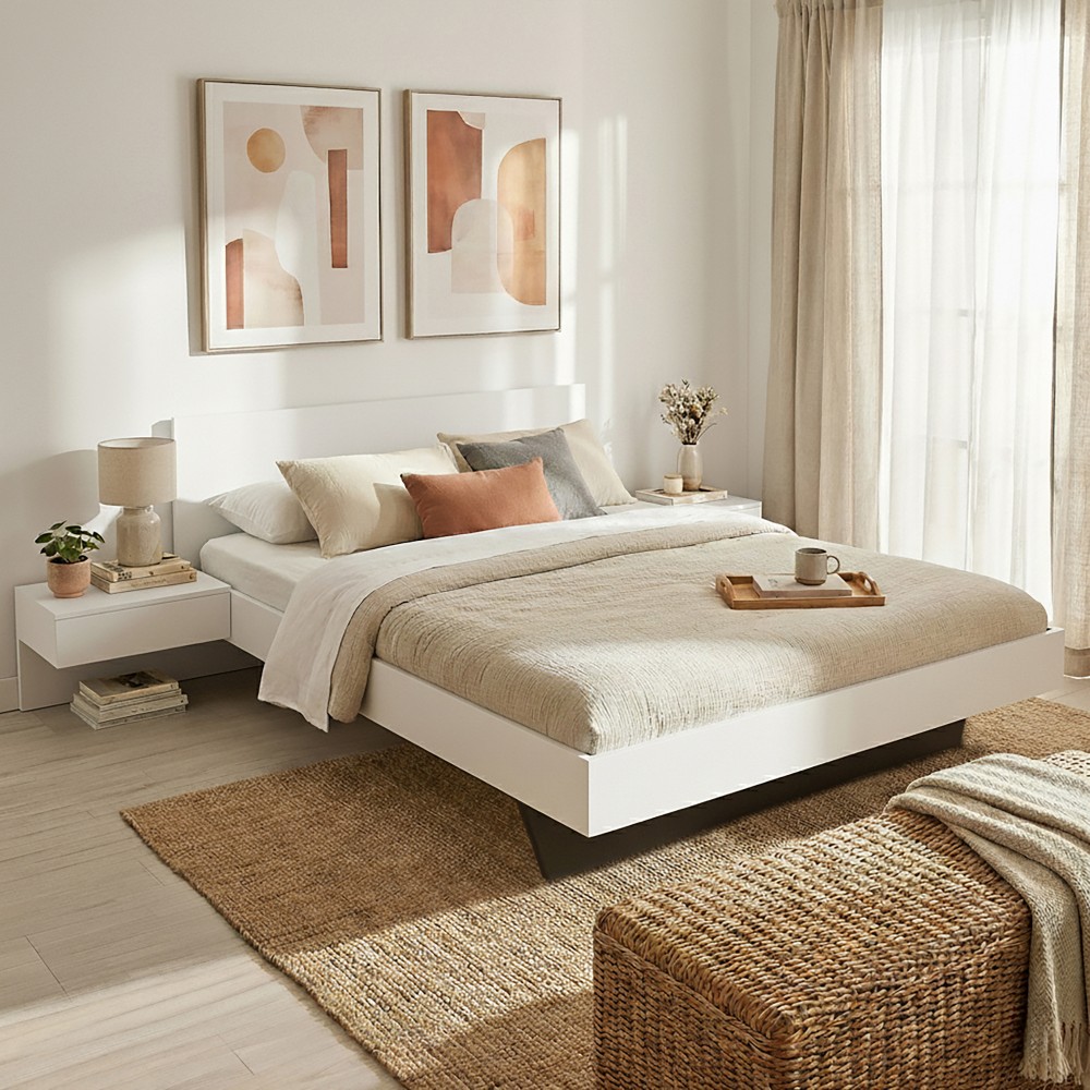 Lit COOL 140x190 cm + 2 chevets + sommier / Blanc