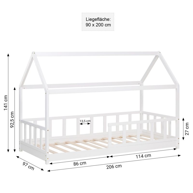 La construction stable en pin massif ainsi que la surface de haute qualité et facile d'entretien rendent la maison de lit particulièrement agréable pour les enfants. La sécurité nécessaire est assurée aussi bien par la surface de couchage basse près du sol que par la protection antichute. Un accès généreux permet à votre enfant d'entrer et de sortir du lit de manière autonome. Sur les 3 autres côtés, le bord de la barrière est fermé. La barrière d'accès peut être montée à gauche ou à droite selon les besoins. Le lit enfant est livré avec des instructions de montage détaillées et un sommier à lattes assorti et est facile à monter. Le matelas, les draps, les coussins et la décoration ne sont pas compris dans la livraison.
