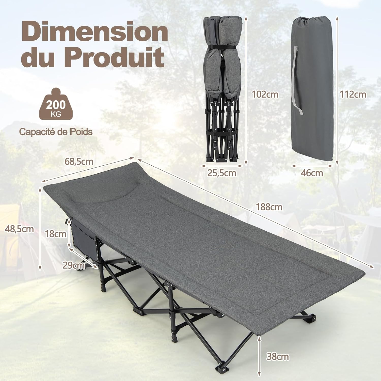 | Libellé | Lit de camp, lit de camping pliant avec 10 pieds de soutien et sac de transport, pour voyage, camping |