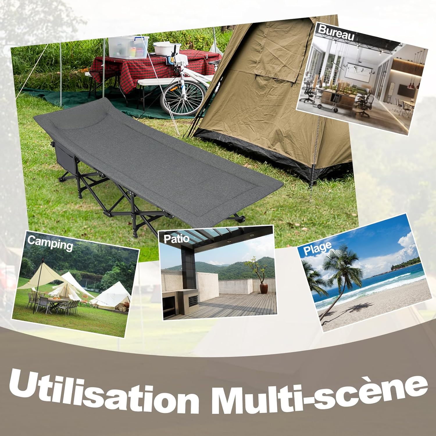 - Large application : le lit de camping offre beaucoup d'espace et s'adapte à la plupart des tailles. Il est polyvalent et convient à une utilisation en intérieur ou à diverses activités de plein air telles que le camping, le barbecue, le pique-nique, la pêche, les voyages, la terrasse, le salon, la chambre, le bureau ou partout où vous souhaitez vous reposer.
