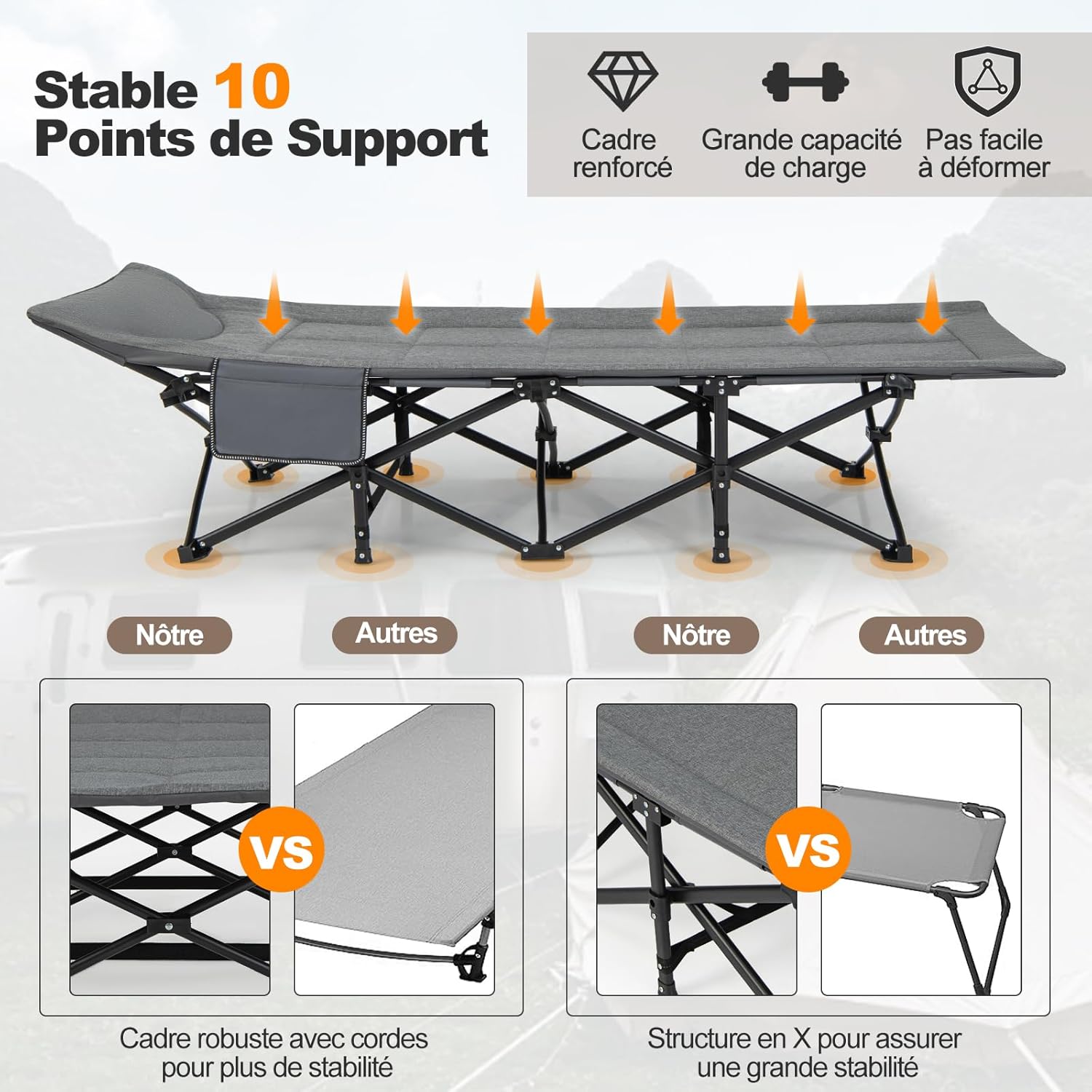 - Construction solide et durable : ce lit de camping est soutenu par un cadre métallique robuste, assurant une structure solide et stable pouvant supporter jusqu'à 200 kg. La surface métallique revêtue de poudre assure la résistance à la rouille et la durabilité. La structure en forme de X du lit de camping et ses 10 points d'appui le rendent également plus stable.