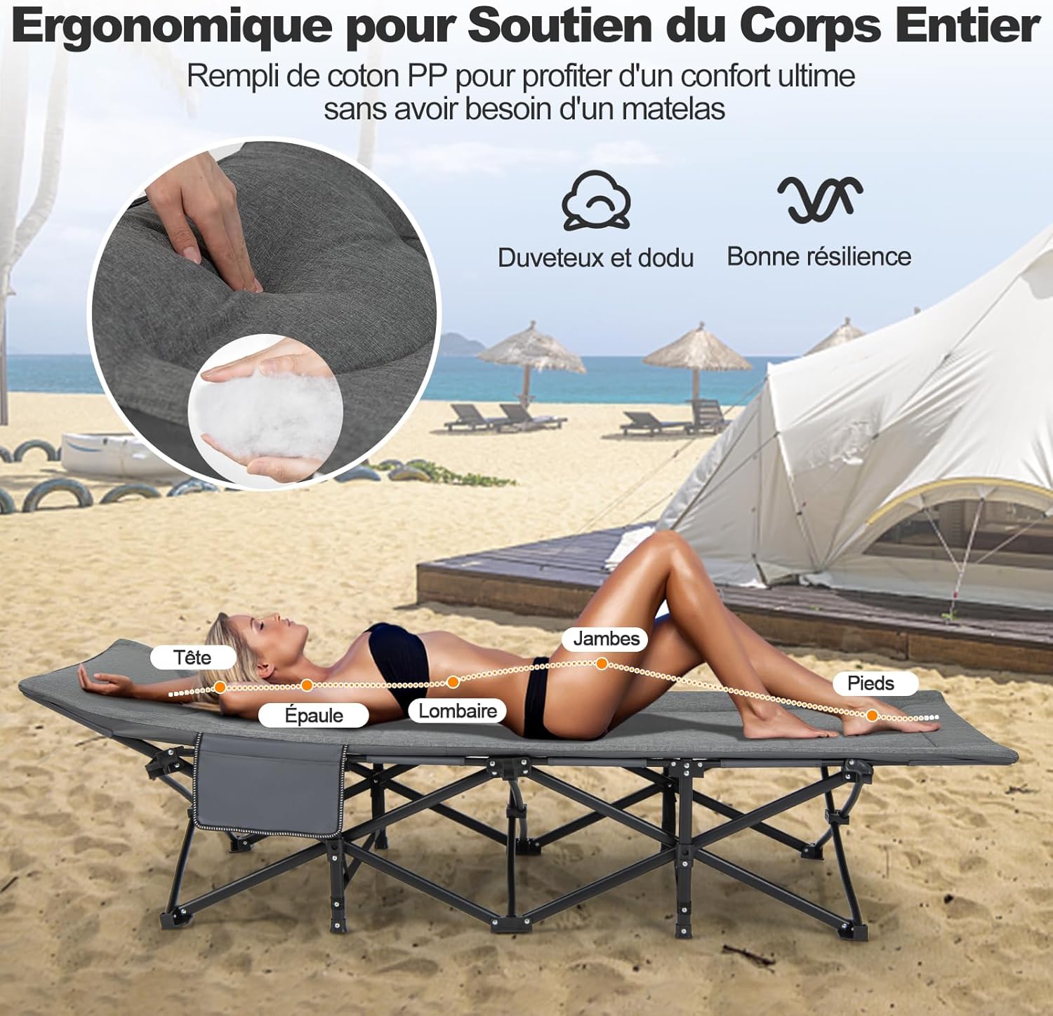 - Expérience de détente confortable : ce lit de camping est livré avec un oreiller doux et confortable rempli de coton PP, offrant une expérience de couchage confortable sans avoir besoin d'un matelas supplémentaire. Le rembourrage est élastique et ergonomique et offre un soutien à tout le corps. De plus, le lit de camping est équipé d'un oreiller surélevé et rembourré pour vous aider à détendre votre cou et votre tête.