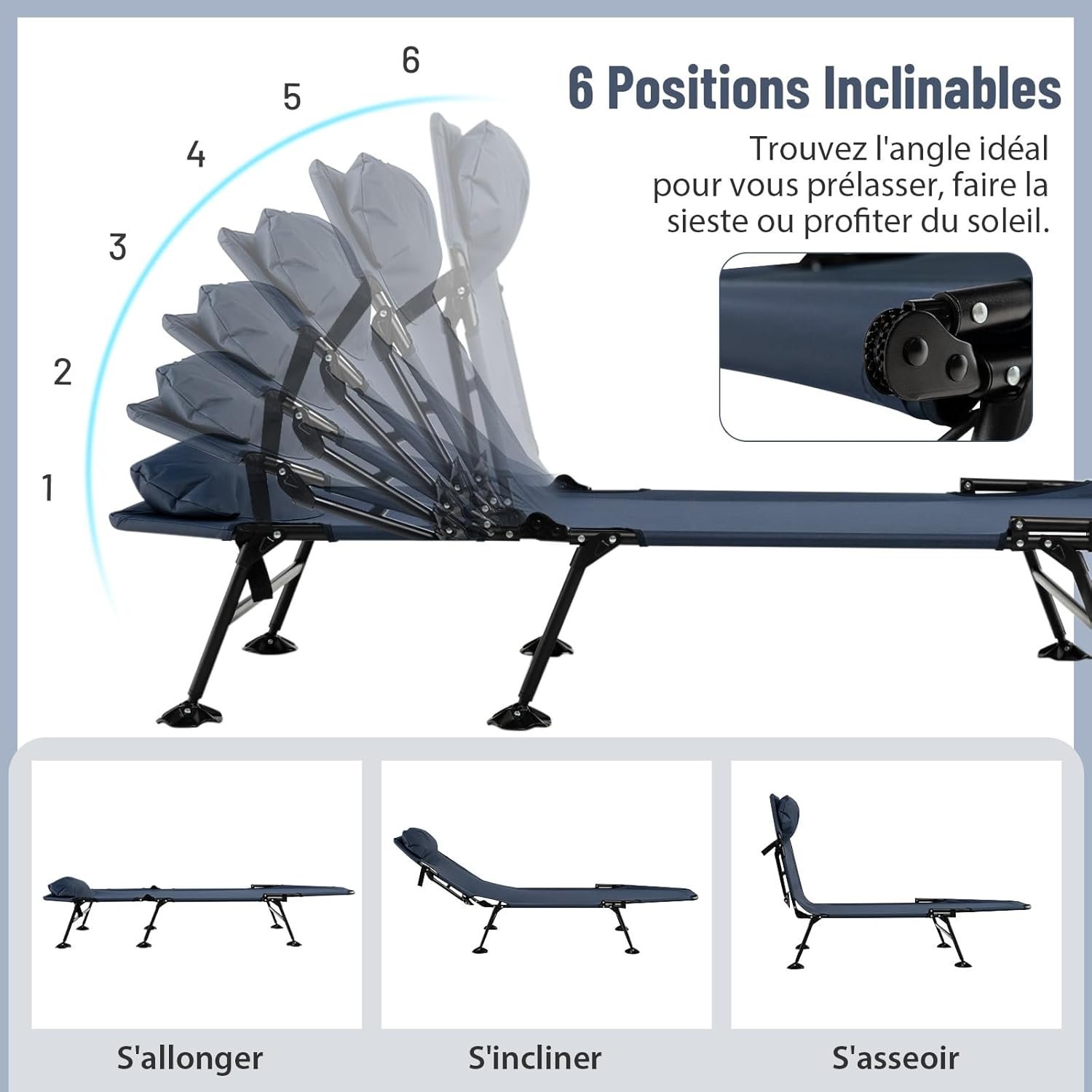 - Dossier Réglable à 6 Positions : Le lit de camping pour adultes dispose d’un dossier réglable à 6 positions pour s’adapter à vos différentes activités. Vous pouvez vous asseoir pour lire un livre, vous allonger à moitié pour écouter de la musique ou vous allonger à plat pour faire une sieste.
