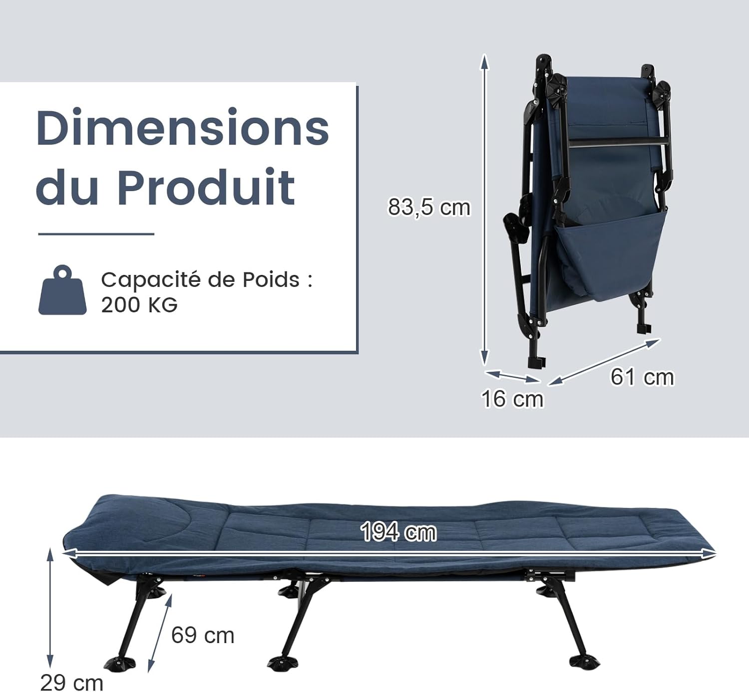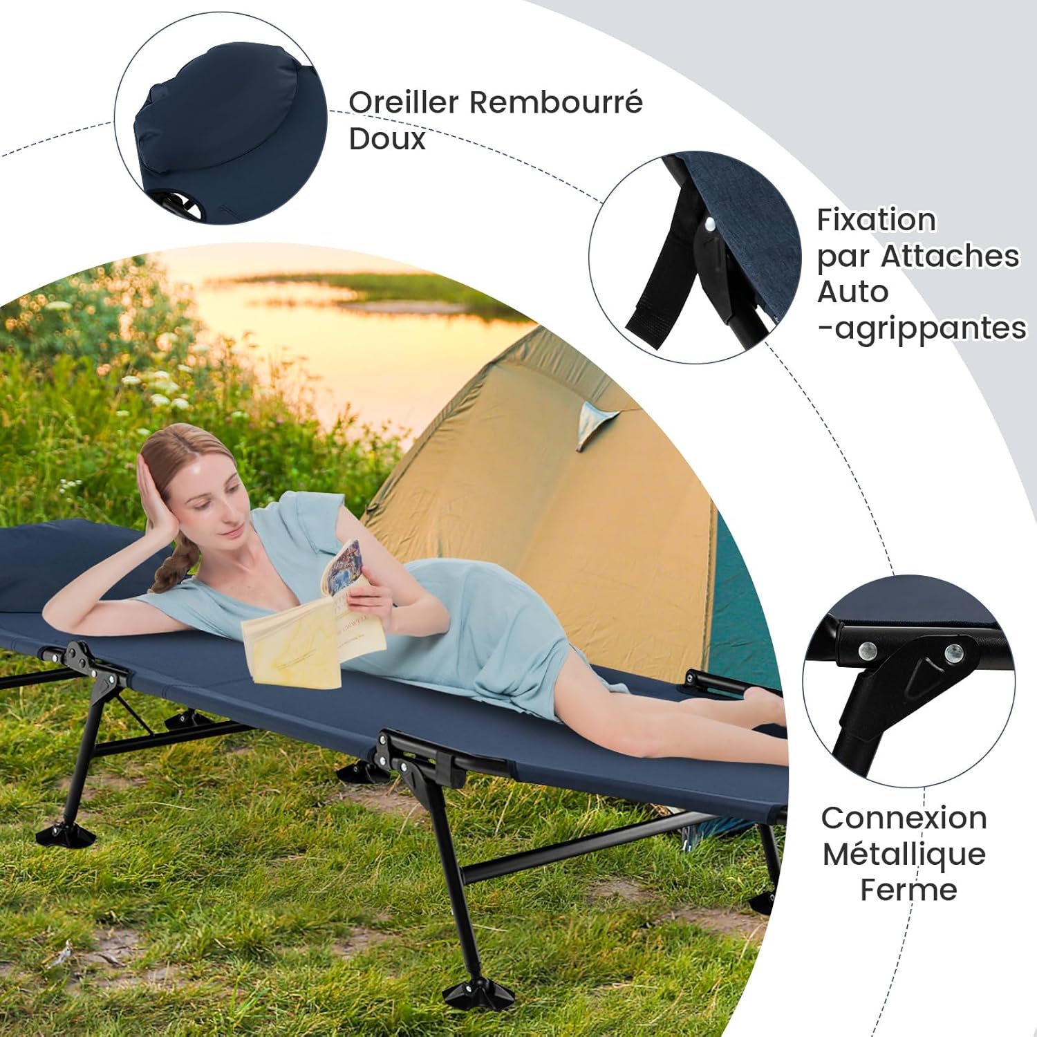 | Libellé | Lit de camping pliable avec dossier réglable, lit de camp portable avec matelas amovible et oreiller |
