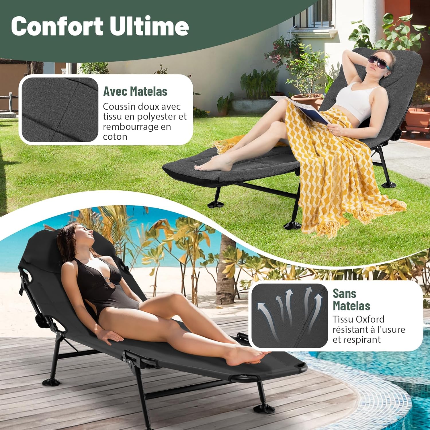 Lit de camping pliable avec dossier réglable, lit de camp portable avec matelas amovible et oreiller