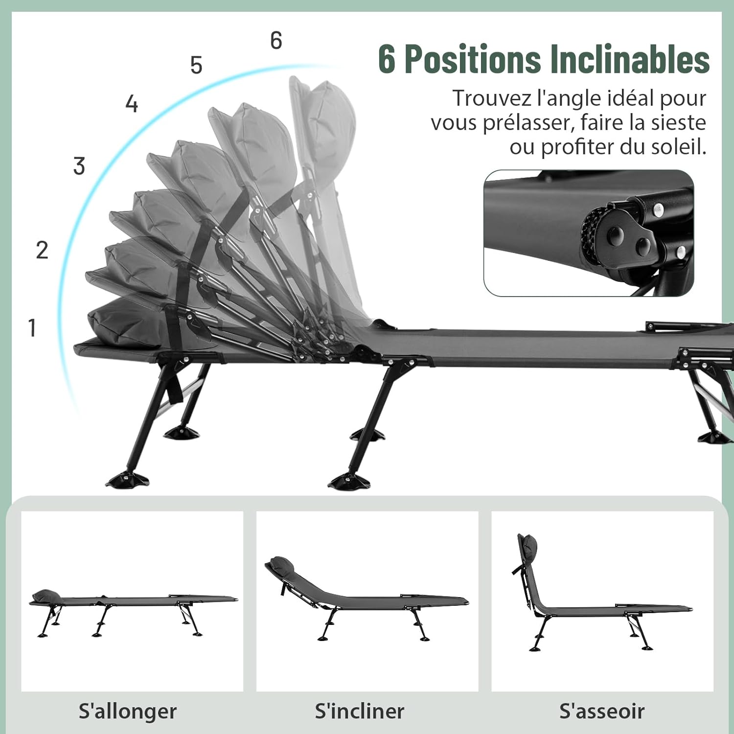 - Dossier Réglable à 6 Positions : Le lit de camping pour adultes dispose d’un dossier réglable à 6 positions pour s’adapter à vos différentes activités. Vous pouvez vous asseoir pour lire un livre, vous allonger à moitié pour écouter de la musique ou vous allonger à plat pour faire une sieste.