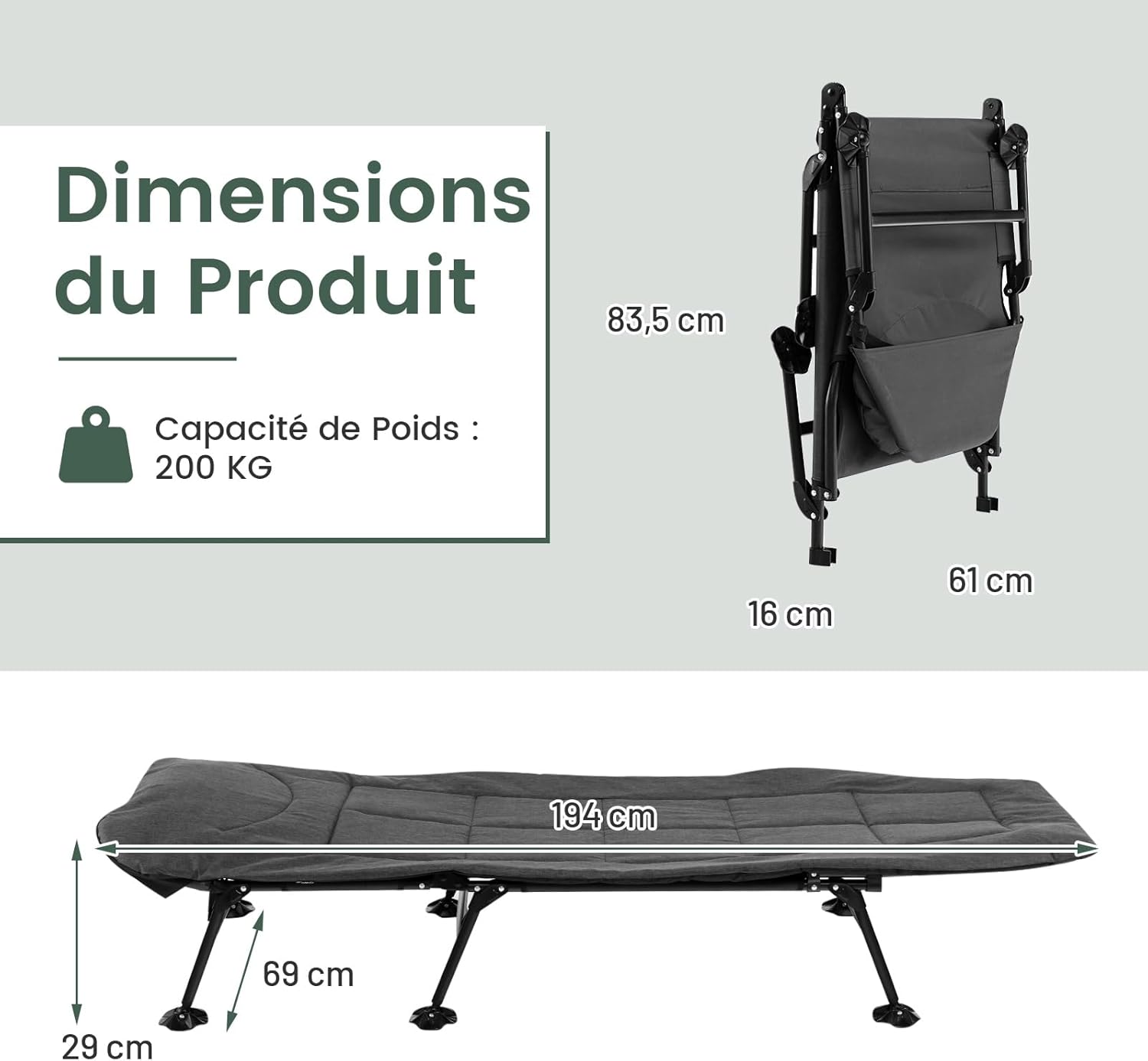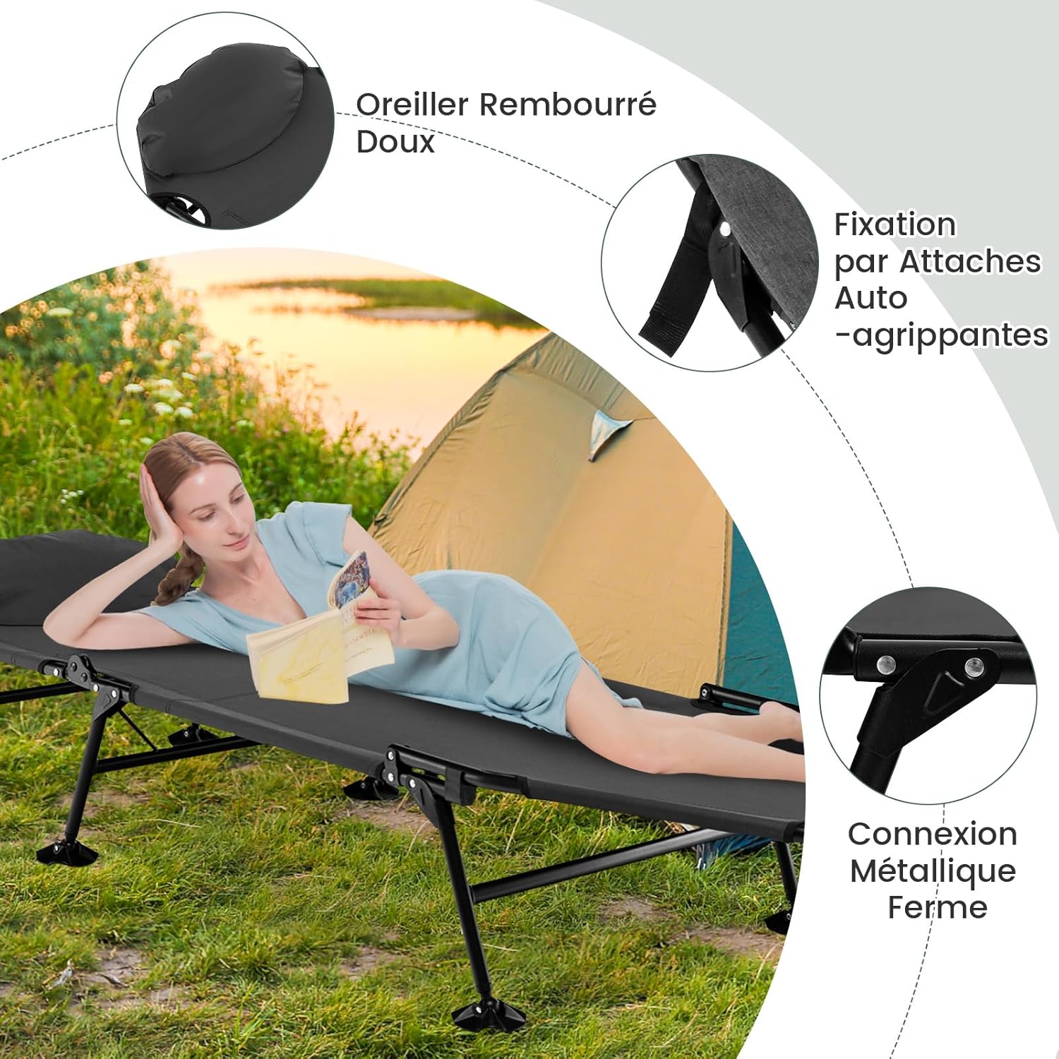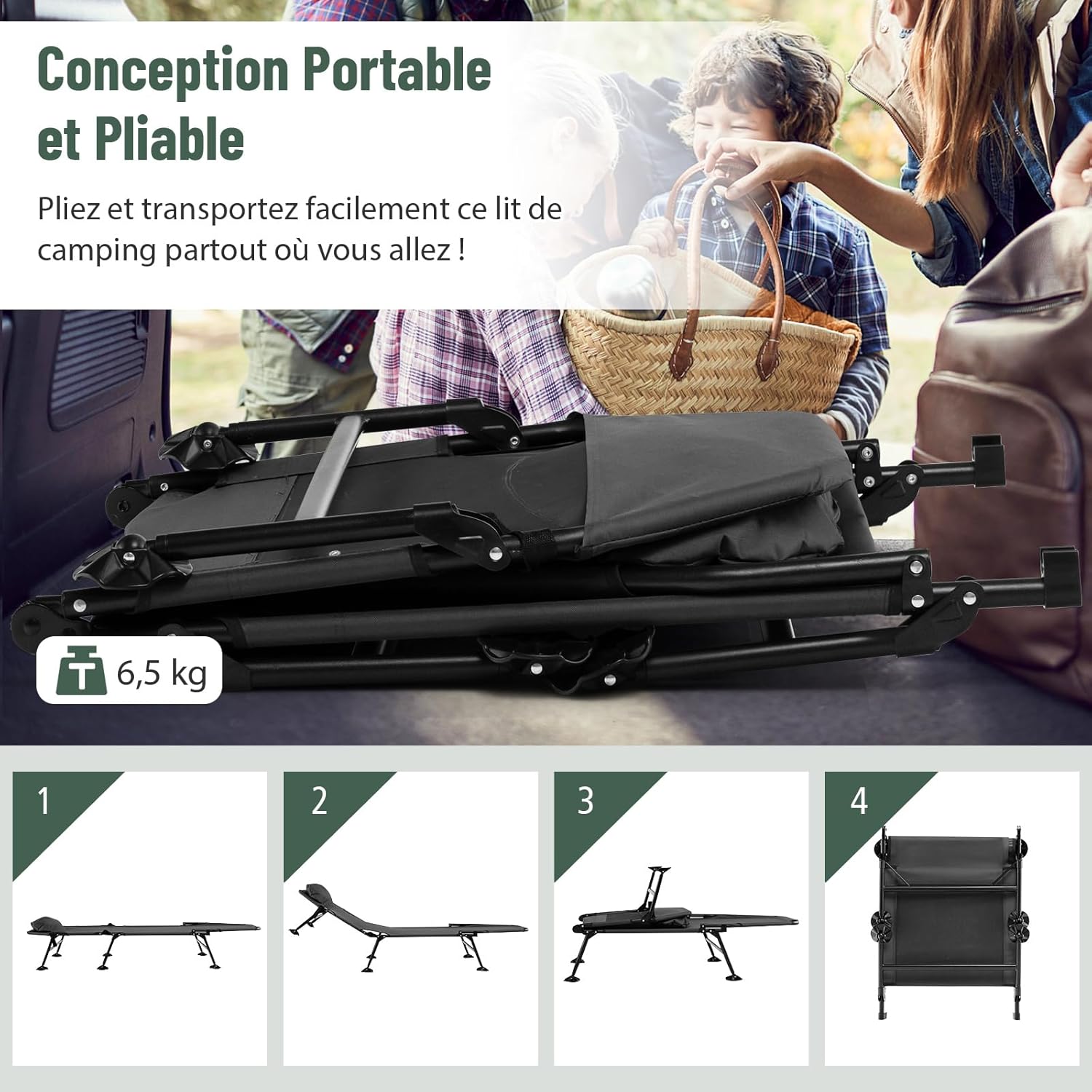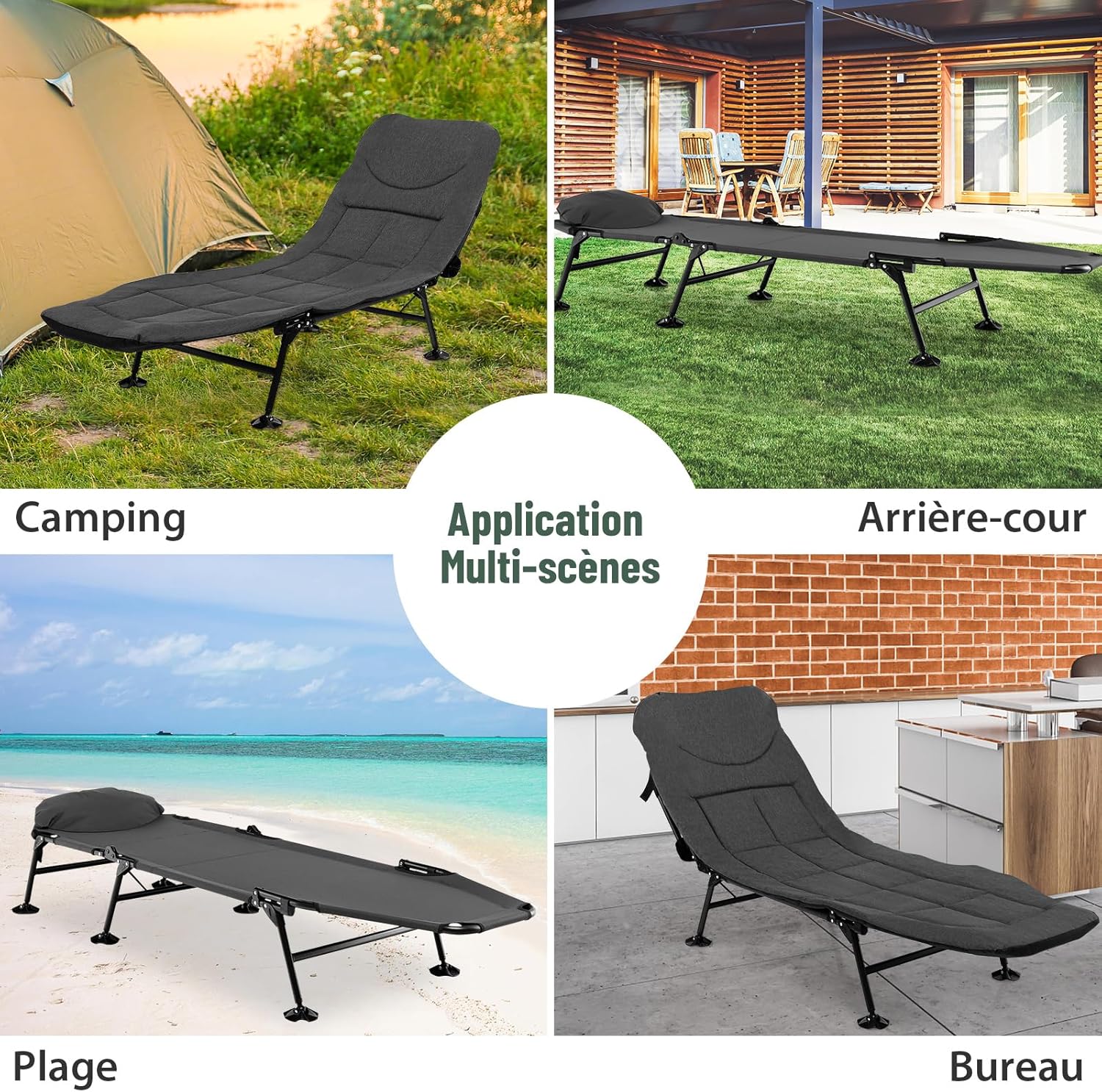 | Libellé | Lit de camping pliable avec dossier réglable, lit de camp portable avec matelas amovible et oreiller |