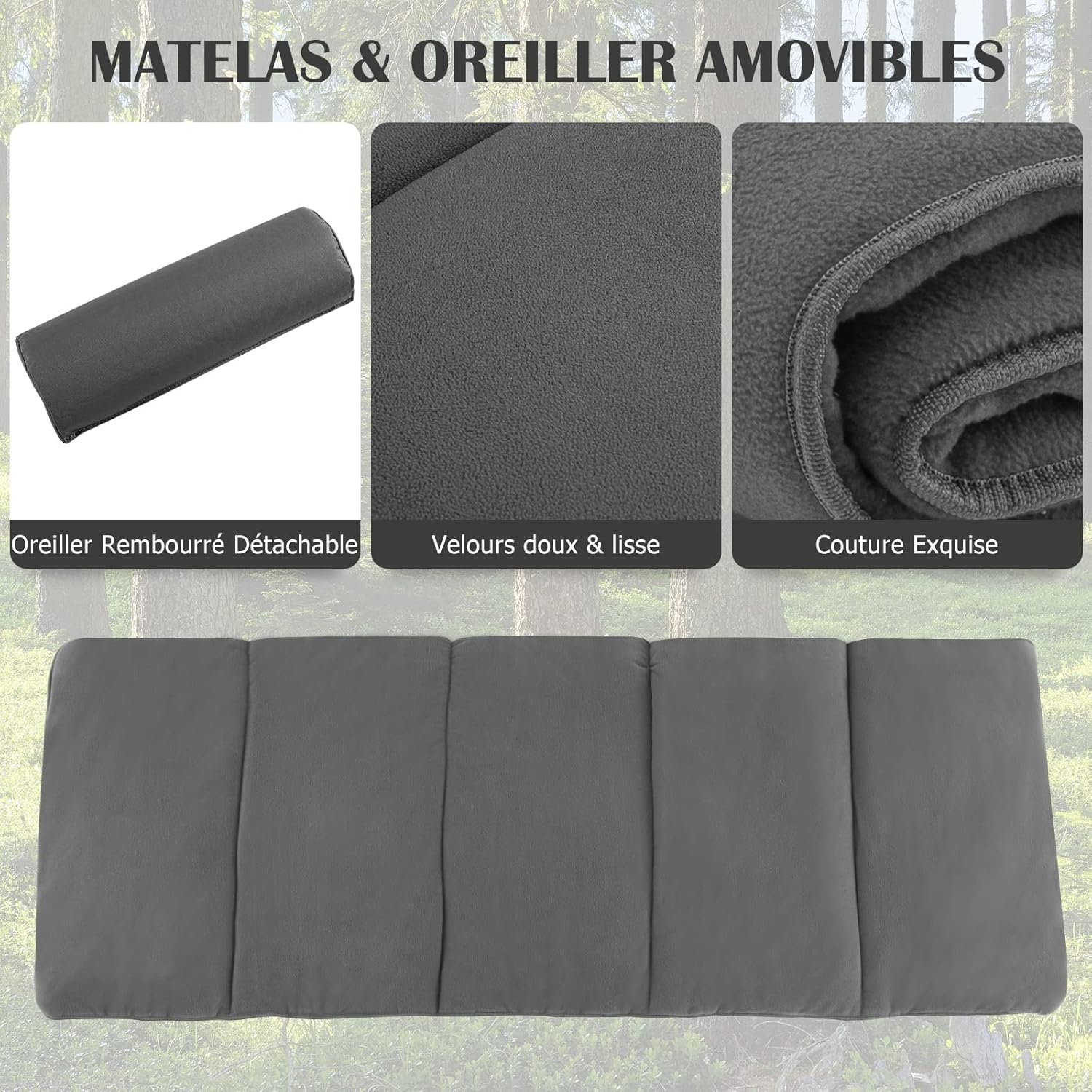 - Design ultra confortable : le lit de couchage extérieur est conçu avec un matelas amovible en peau de daim, respirant et confortable, vous offrant une expérience de sommeil de qualité par temps froid. De plus, il est également équipé d'un oreiller rembourré amovible(7cm) pour détendre votre cou et votre tête.De plus, le lit de camp est fabriqué en toile Oxford 600Dx300D avec un revêtement imperméable appliqué sur le dessous.
