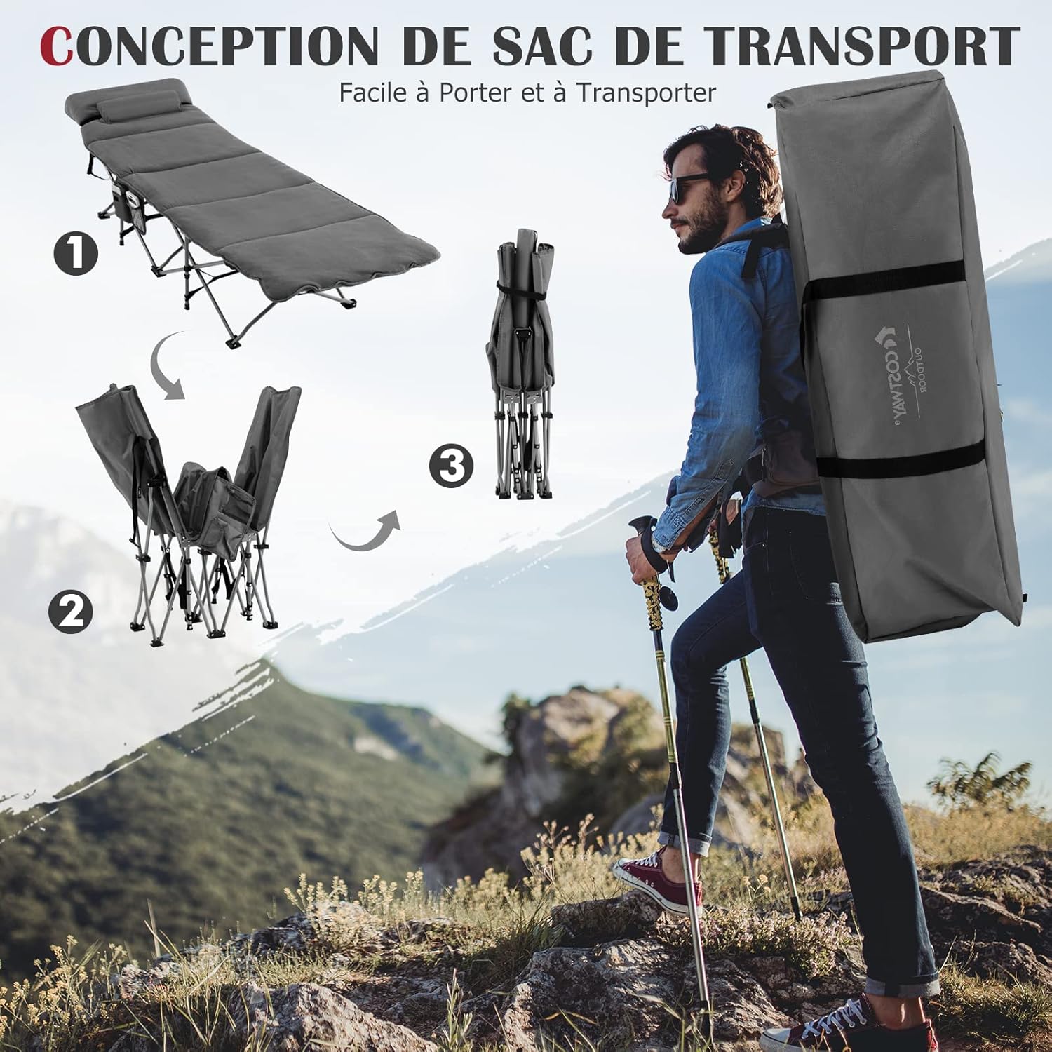 Lit de camping pliant avec matelas et oreiller amovibles, lit de couchage portable avec sac de transport