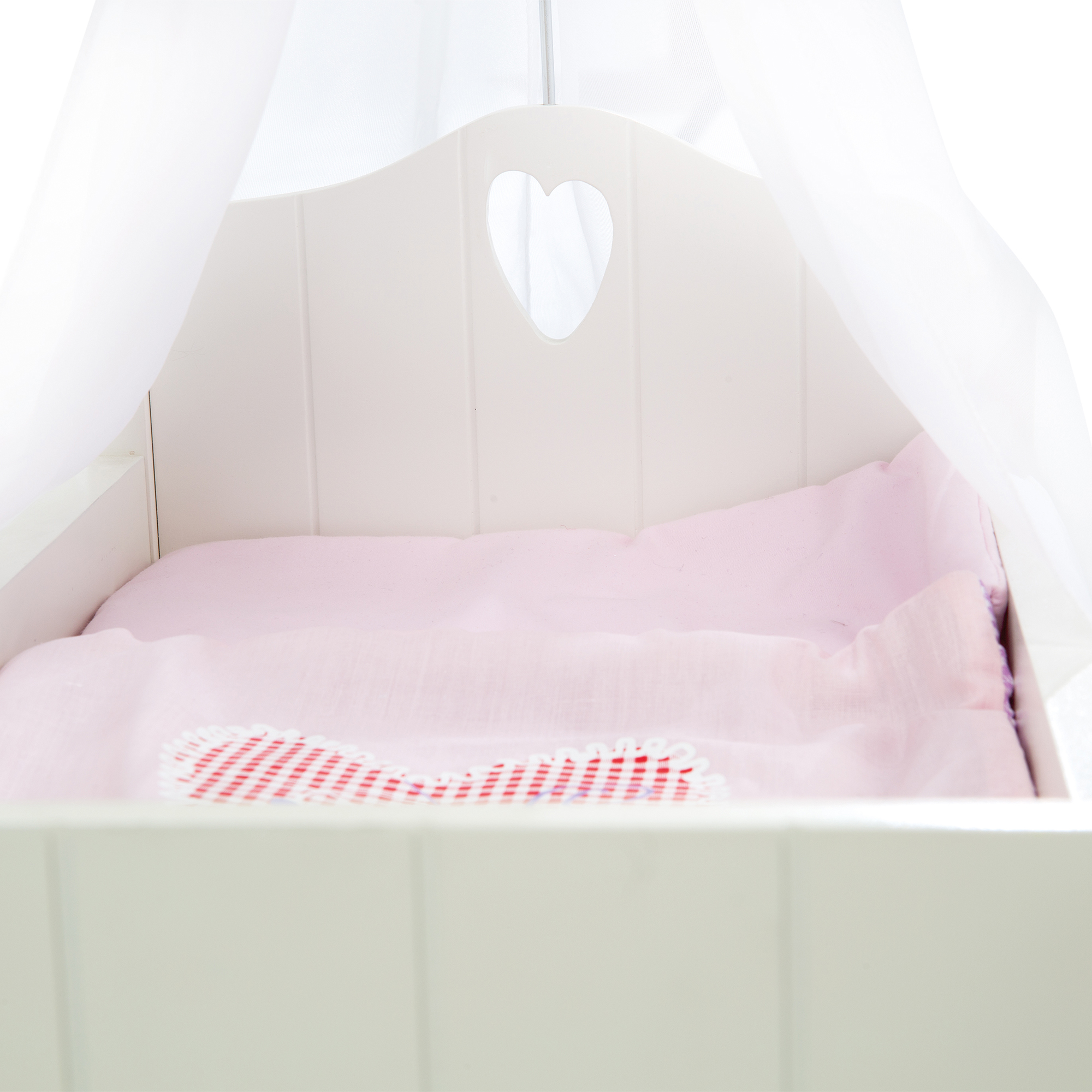 Le lit de poupée roba "Fienchen" est laqué blanc et comprend des accessoires textiles. Le lit de poupée adapté aux enfants est livré avec la literie (1 oreiller, 1 couverture) et un magnifique baldaquin avec un pendentif en forme de cœur. Les accessoires textiles sont imprimés d'un joli motif de cœur et invitent les petites poupées à dormir et à rêver. Assortis à l'armoire, de nombreux autres articles de notre gamme "Fienchen" invitent à apprendre, jouer, s'asseoir ou simplement aimer. Convient aux enfants de 3 ans et plus. L'ameublement de la collection de poupées "Fienchen" avec la forme de cœur et le fraisage des façades ainsi que l'impression des textiles confèrent son caractère délicat de maison de campagne. Le lit de poupée est livré démonté. L'assemblage est très facile. Tous les matériaux utilisés sont testés pour les substances nocives et certifiés. En outre, ils sont régulièrement contrôlés pendant la production.