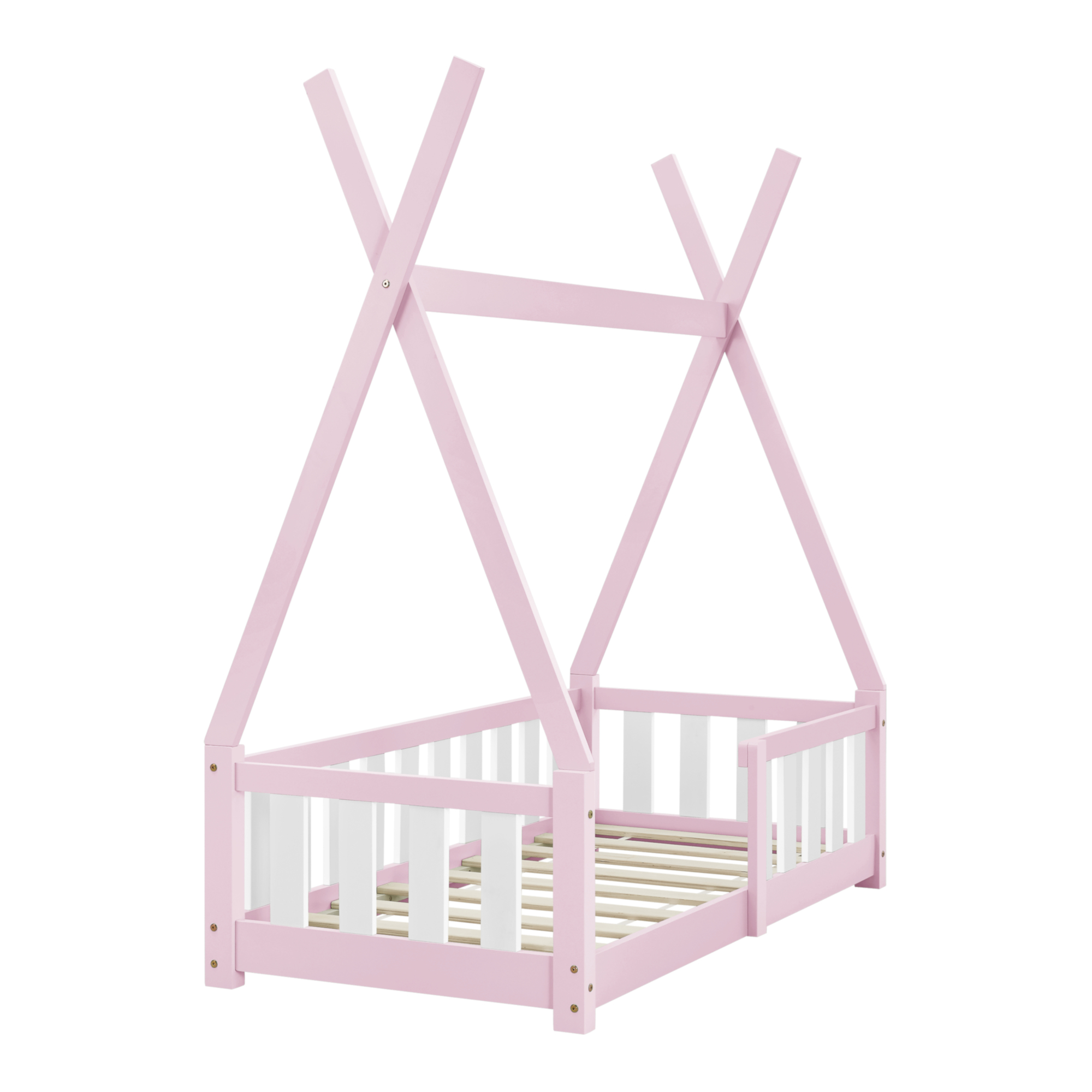 Lit de Tipi pour Enfant en Bois Naturel avec Sommier à Lattes et Grille de Sécurité