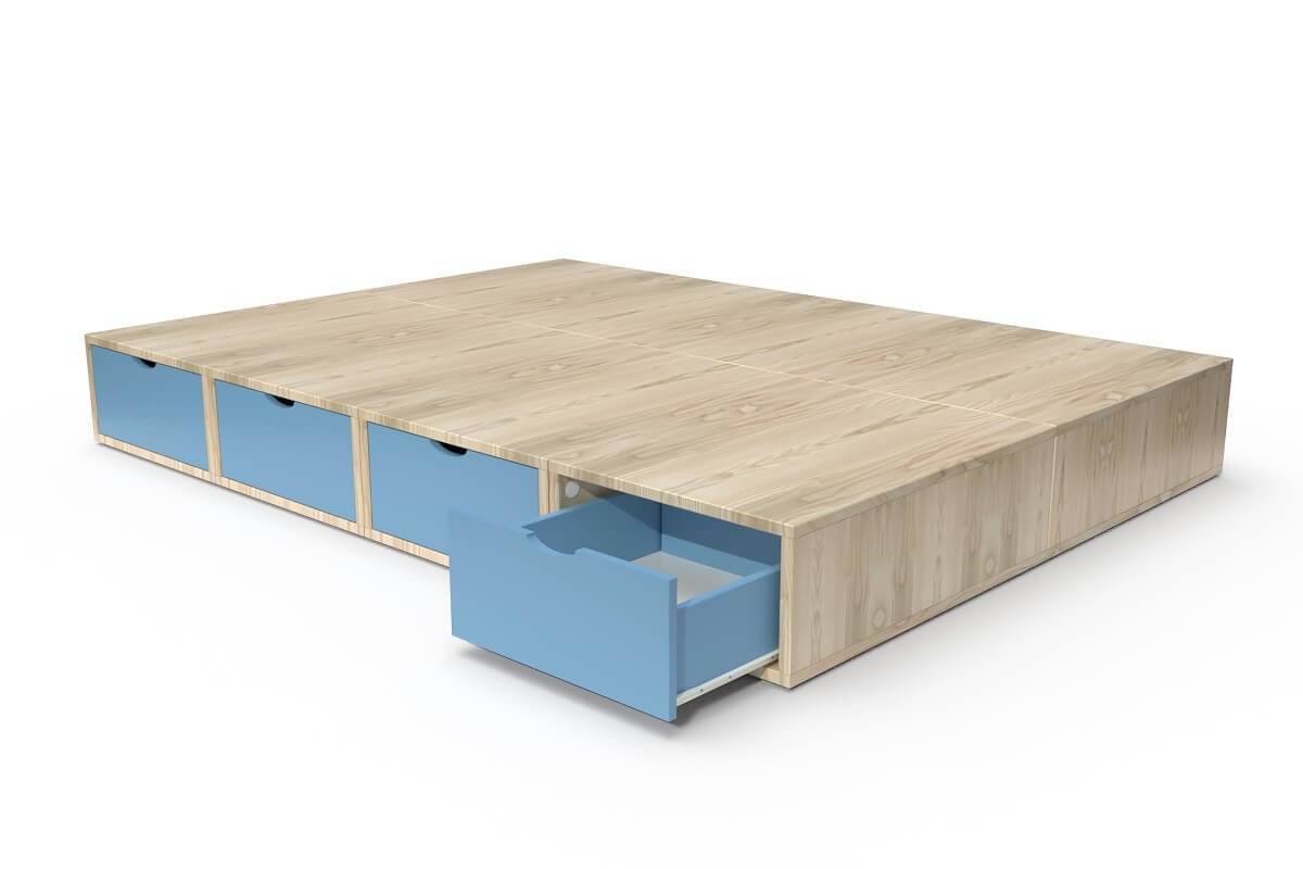 Lit double avec rangement tiroirs Cube, Couleur: Vernis naturel/Bleu Pastel, Dimensions: 140x200