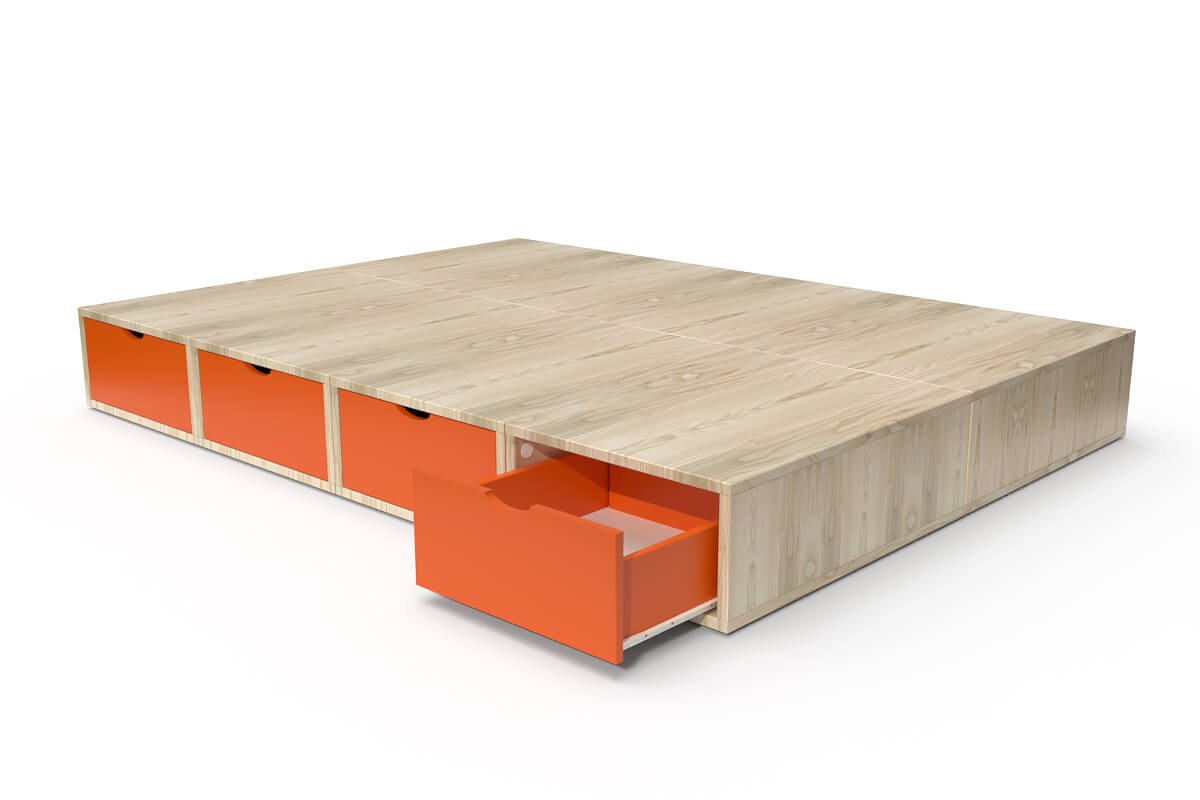 Lit double avec rangement tiroirs Cube, Couleur: Vernis naturel/Orange, Dimensions: 140x200
