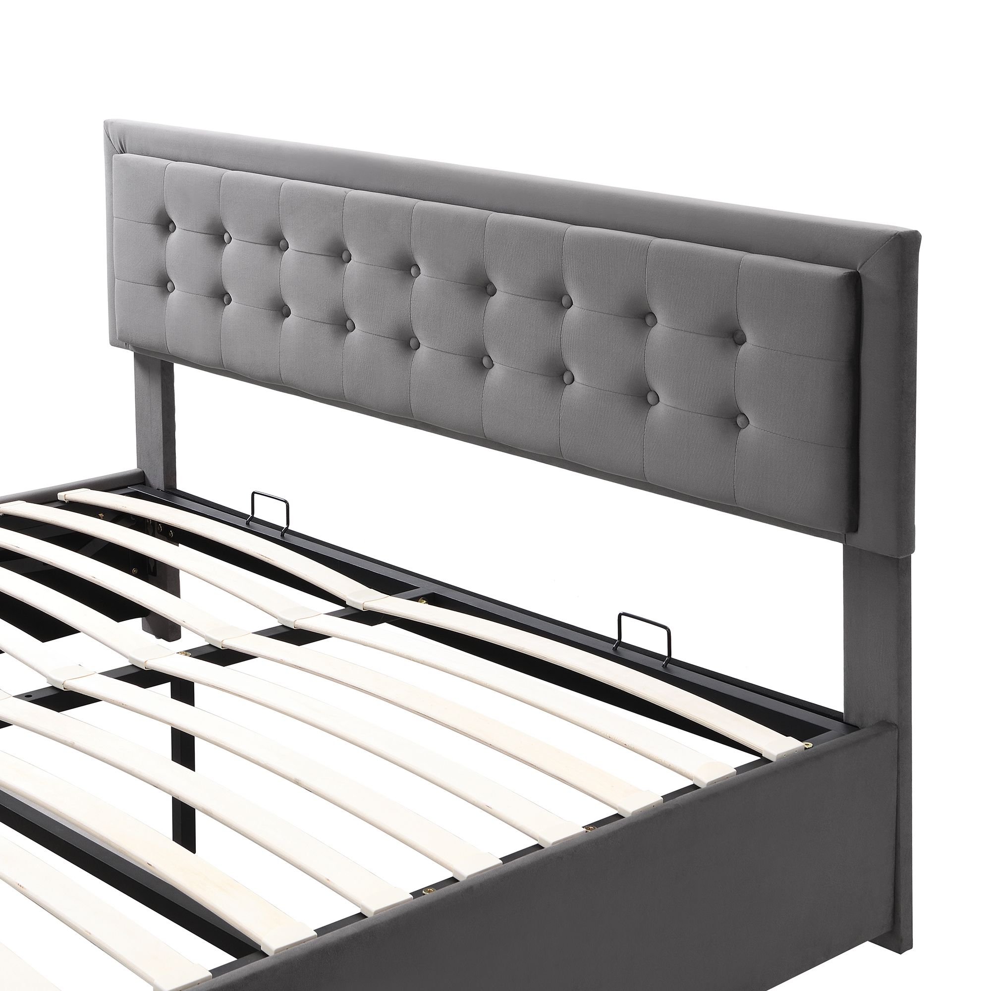 Lit double capitonné 160 x 200, avec coffre et tiroirs, tissu velours, grand espace de rangement, gris