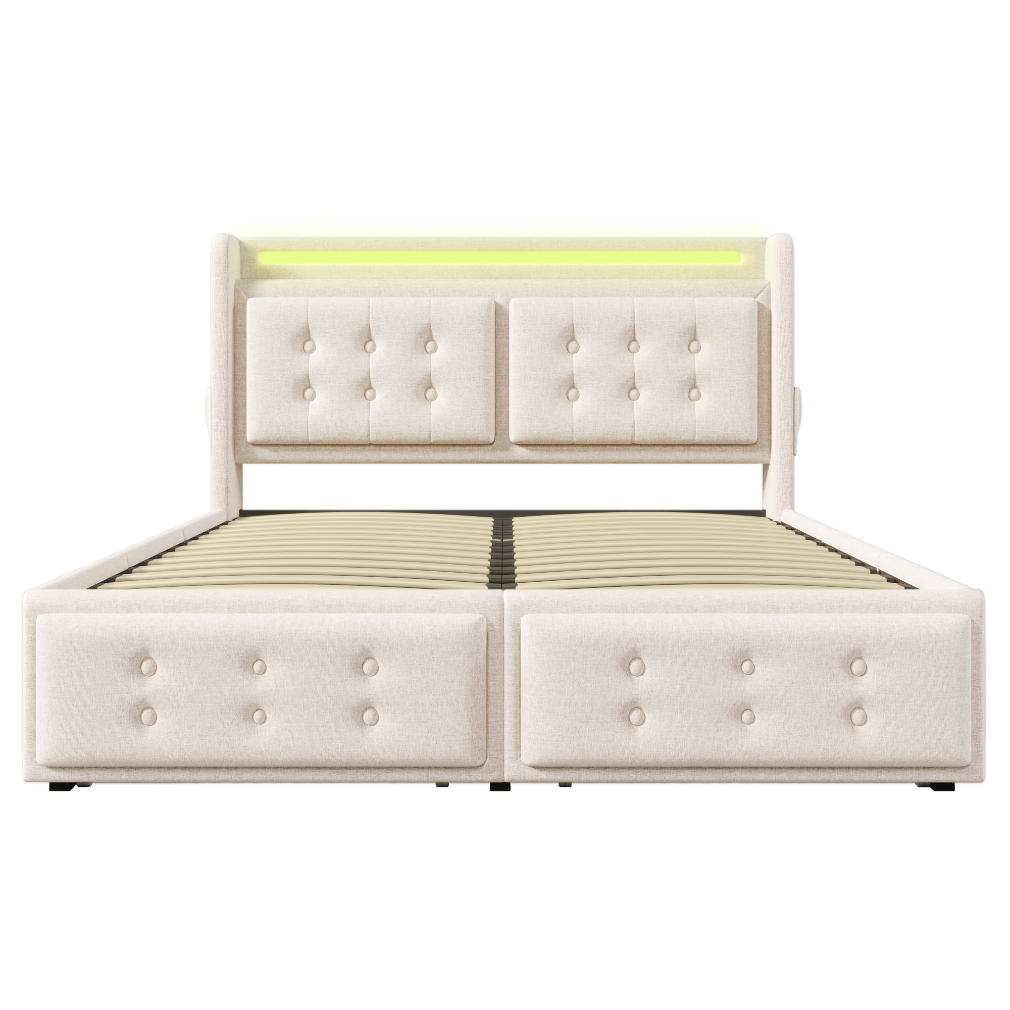 Lit double capitonné 180x200 avec tête de lit Led et chargeur USB C + 4 tiroirs, beige (sans matelas)