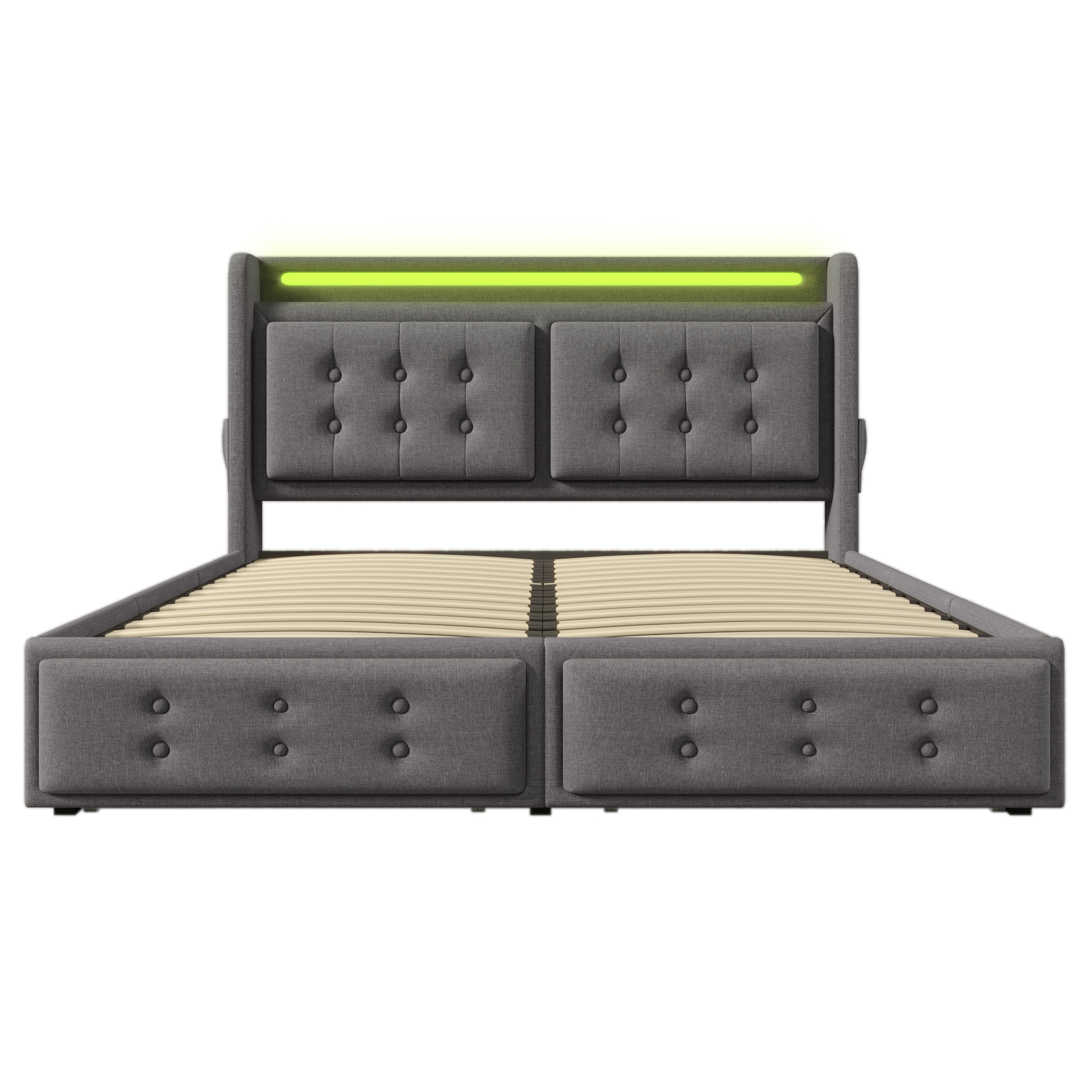 Lit double capitonné 180x200 avec tête de lit Led et chargeur USB C + 4 tiroirs, gris (sans matelas)
