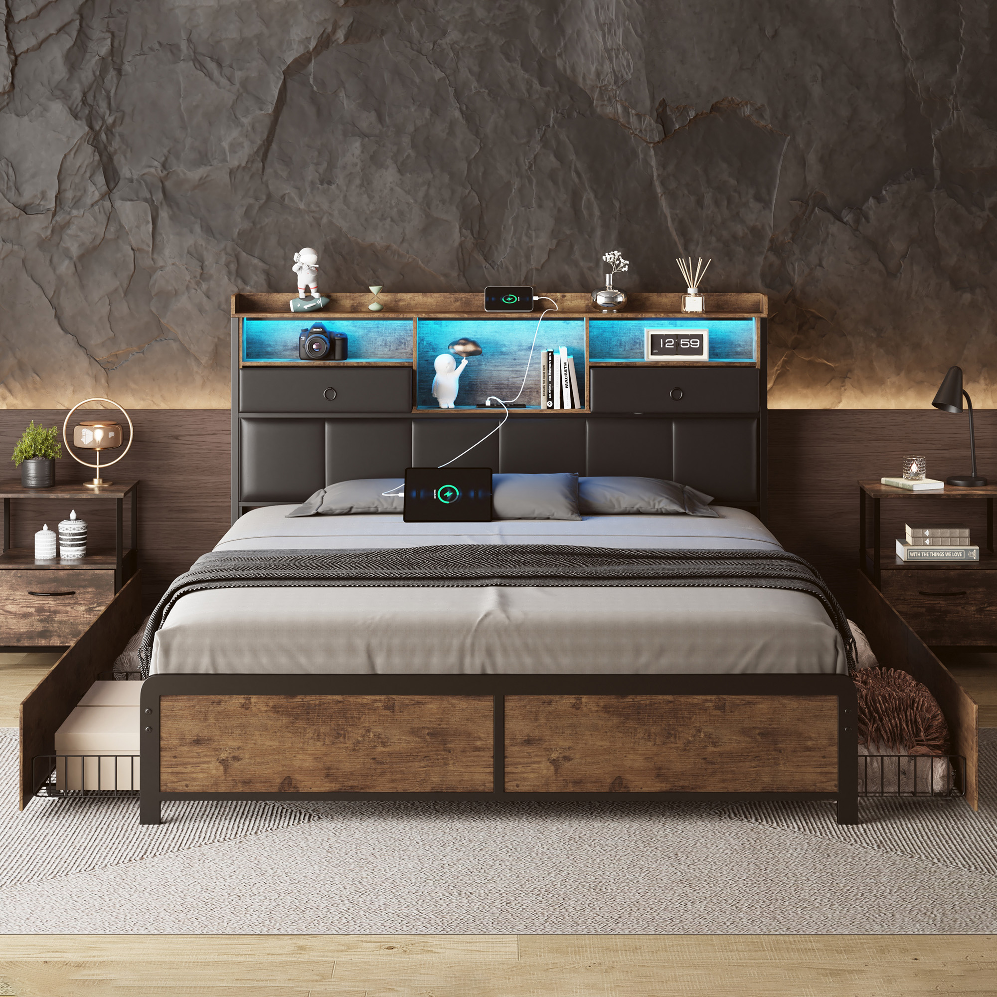 • 【Beaucoup d'espace de rangement】 Il y a une étagère dans la tête de lit où vous pouvez ranger diverses choses, comme des livres ou des magazines, afin que vous puissiez lire confortablement au lit - très pratique. Il y a également 4 tiroirs à roulettes pour ranger vos vêtements, literie, housses de couette, etc.