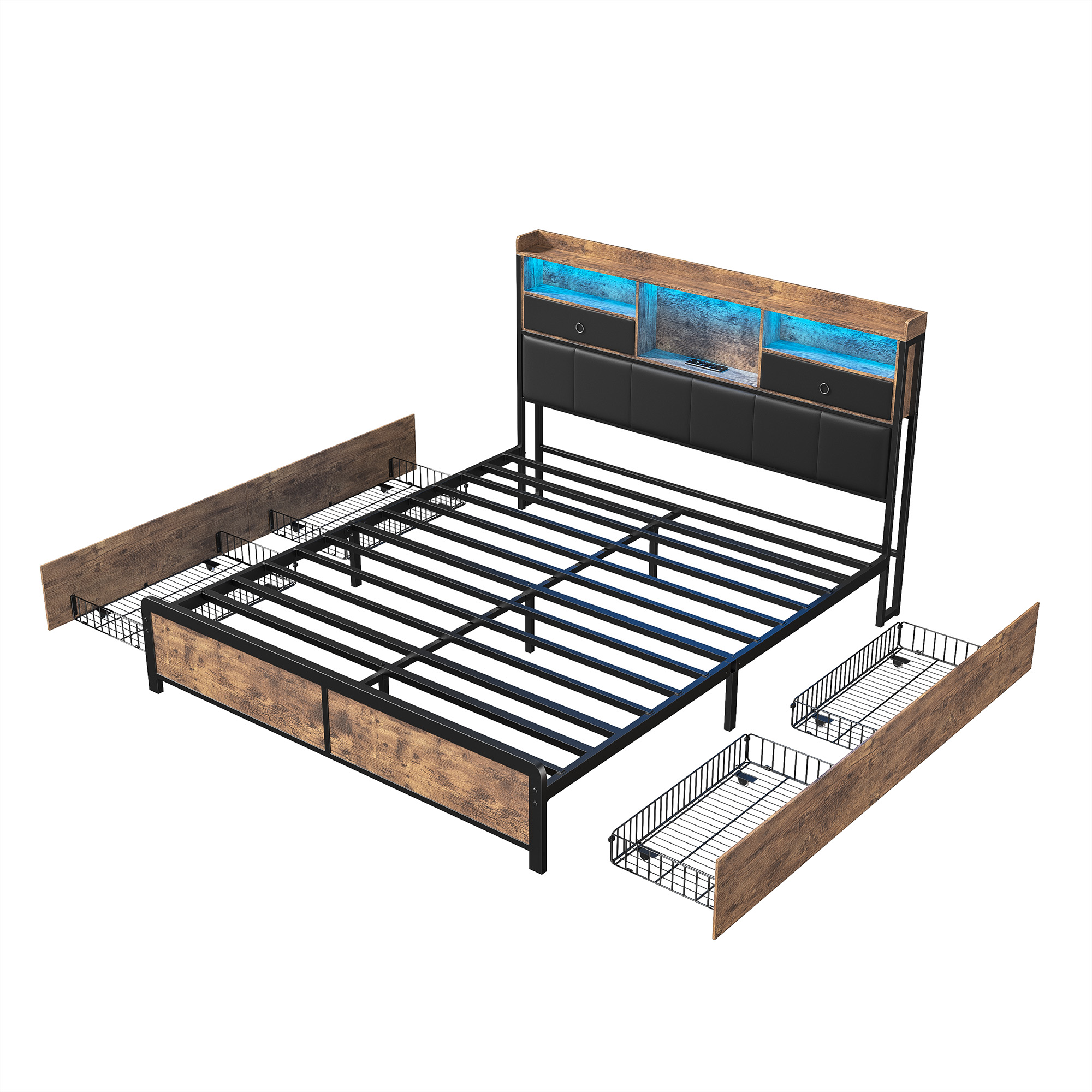 Libellé Lit double en métal 160x200cm, lit jeunesse avec LED et étagère, lit coffre avec 4 tiroirs, noir