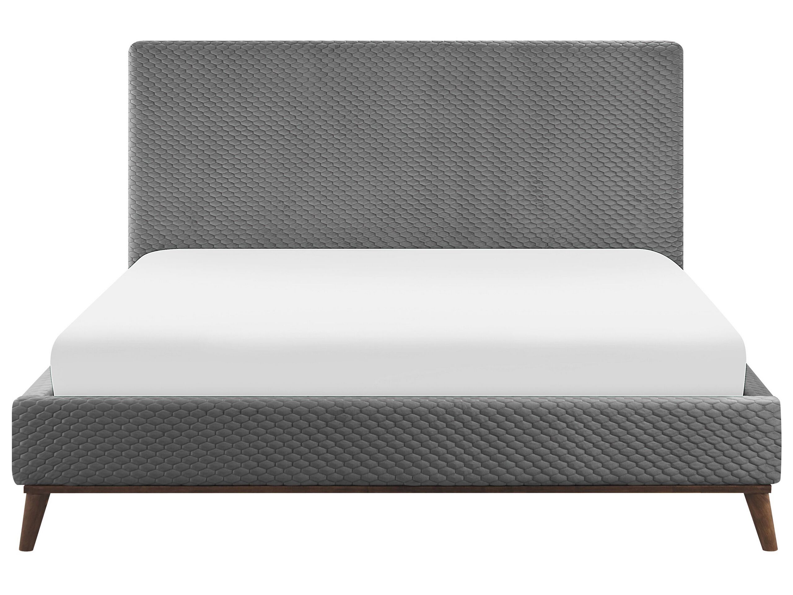 Lit deux places. Ce lit moderne convient parfaitement à toutes les chambres à coucher et vise un équilibre parfait entre élégance et simplicité. La tête de lit matelassée de forme rectangulaire et l’ensemble des côtés sont en velours doux et facile à entretenir dans une nuance de gris profond. La construction en bois assure la stabilité du lit, tandis que les pieds élégants en bois s'harmonisent à merveille avec l'ensemble.
