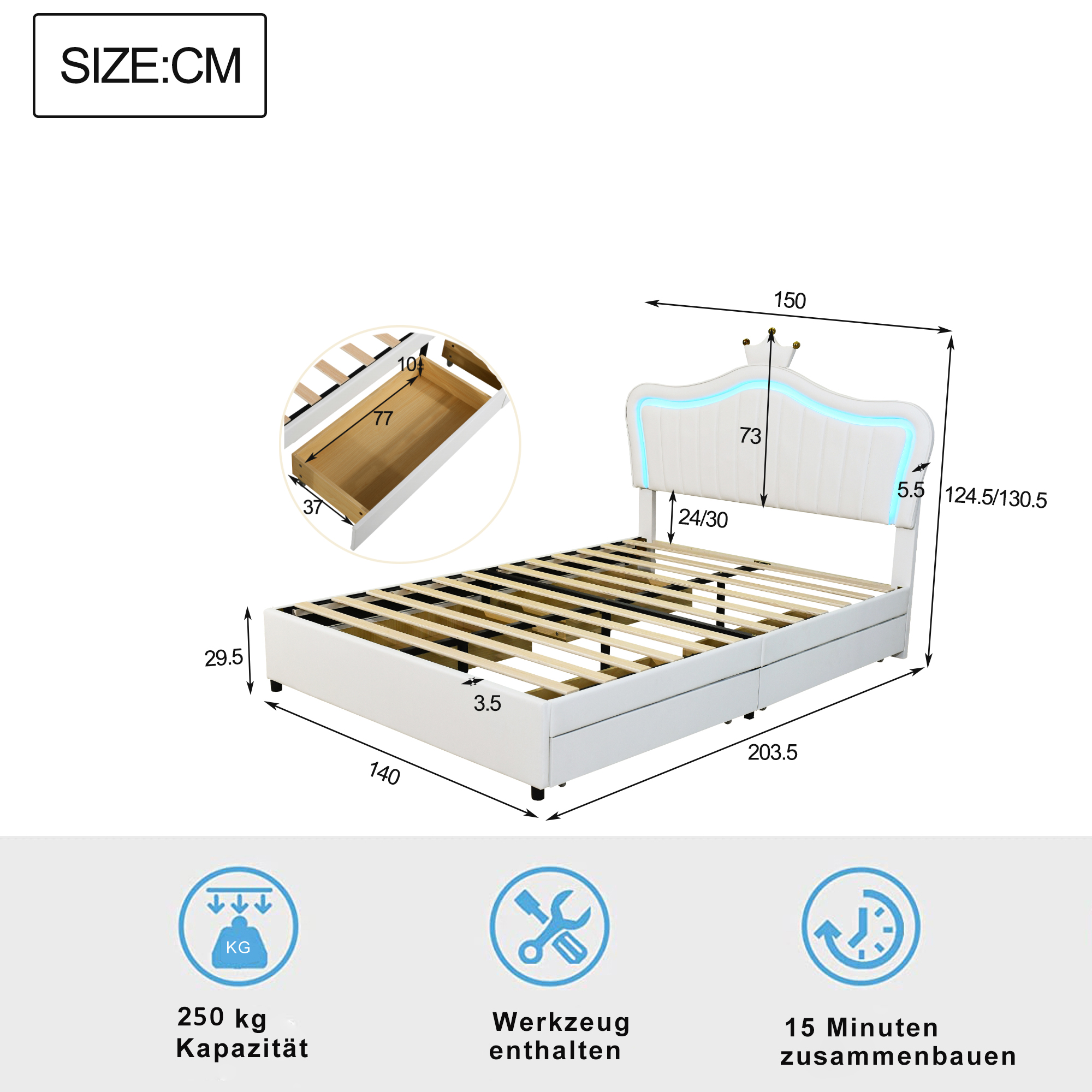 203,5 x 150 x 122–130,5 cm. La tête de lit est réglable sur 2 positions et supporte un poids maximal de 250 kg. Tout le nécessaire est livré dans un carton spécialement conçu pour la livraison express, directement chez vous