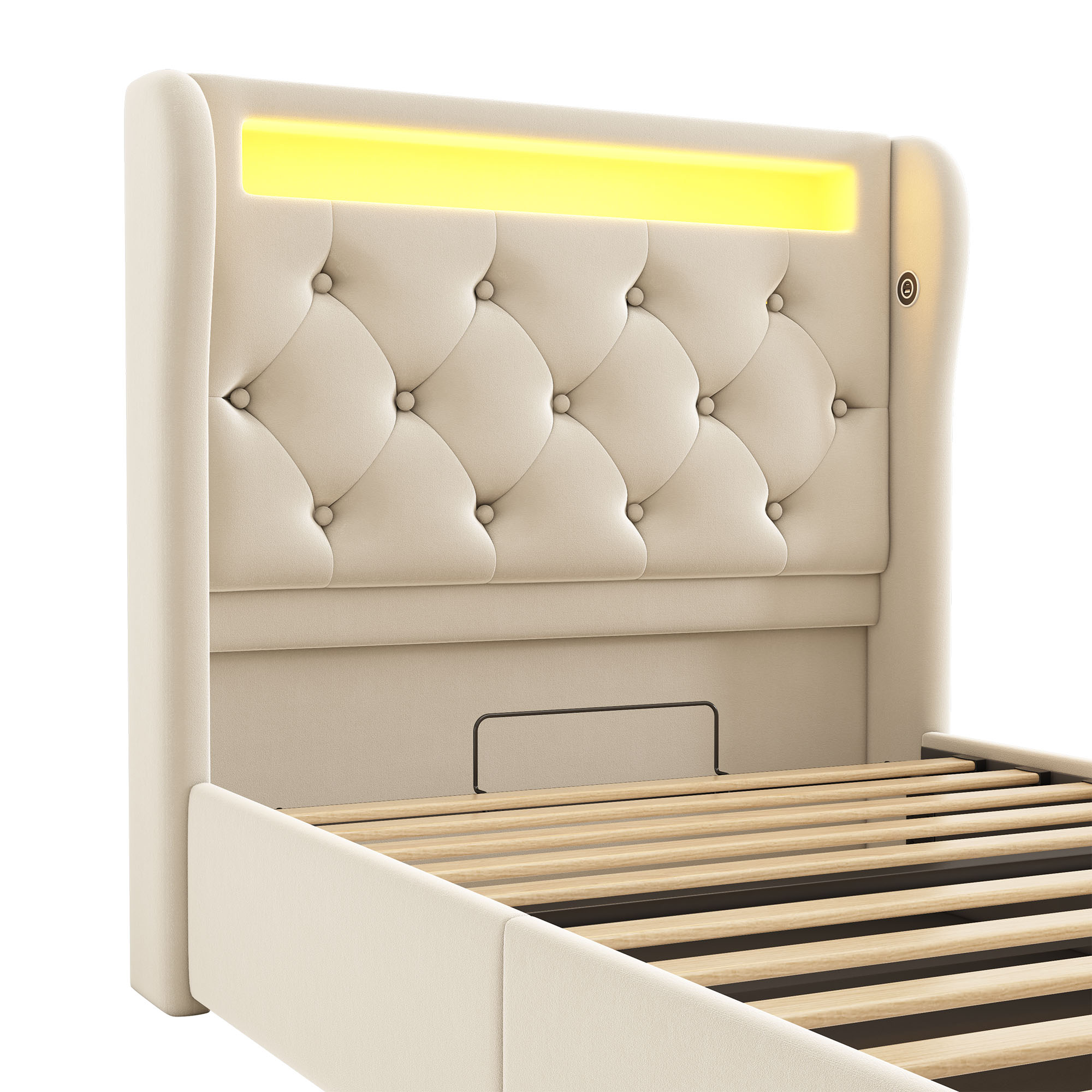 Libellé Lit enfant 90 x 200 cm, avec éclairage LED, tête de lit avec ports USB et Type-C, velours, beige,sana matelas
