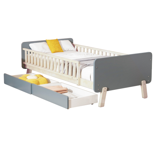 Lit enfant 90x190 avec 2 tiroirs, lit simple en bois massif avec sommier à lattes, gris