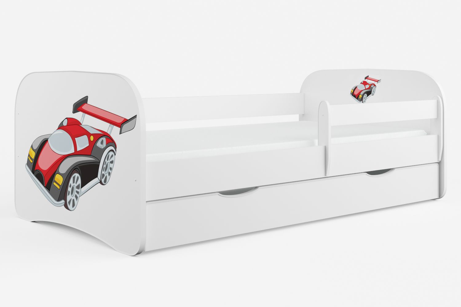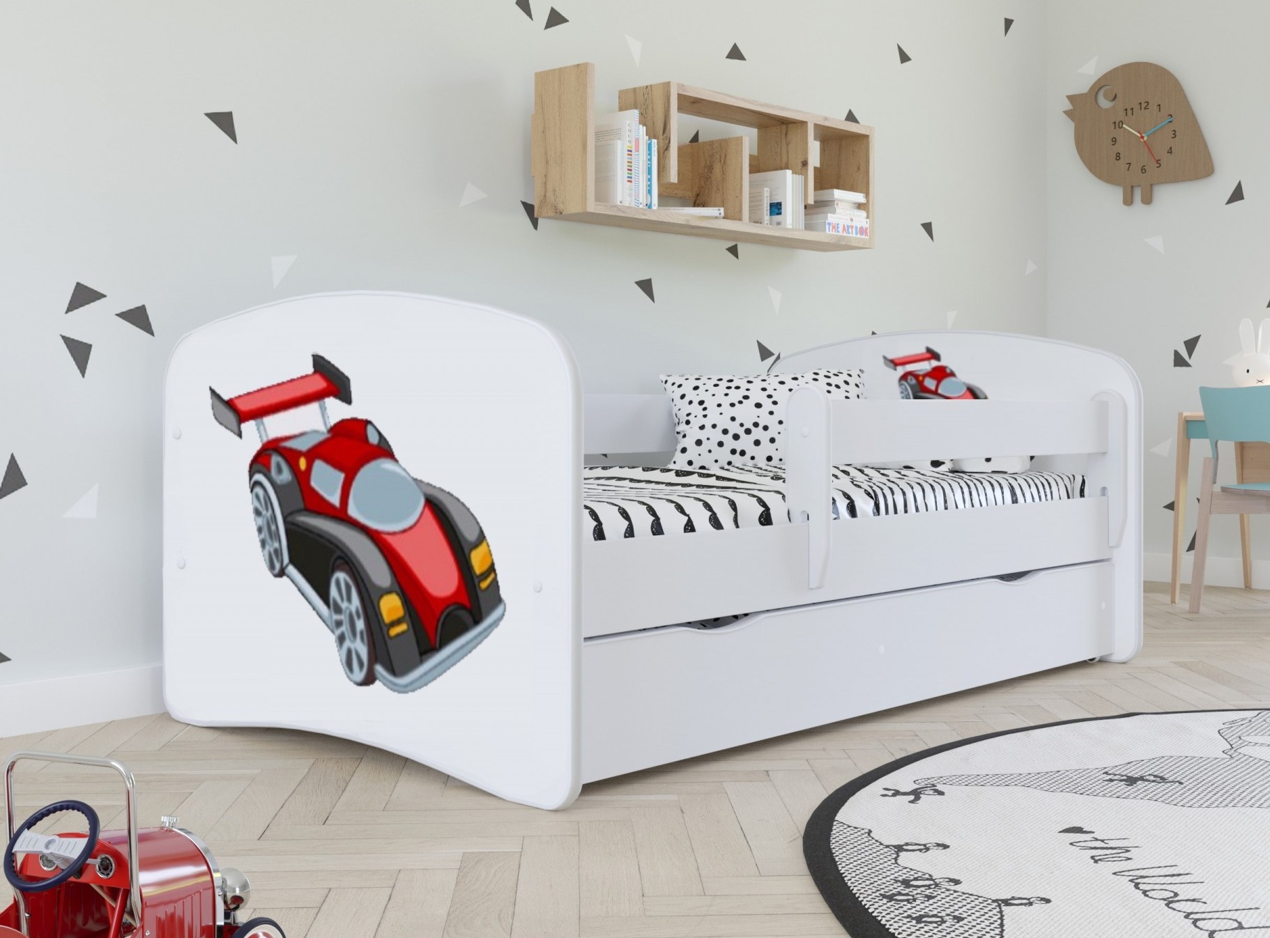 Ce lit enfant livré avec un sommiers à lattes et une barrière de sécurité est idéale pour une transition entre le lit bébé et un lit d'enfant. Votre enfant sera ravi par ce modele qui se distingue par un graphisme automobile. 3 couchages sont disponibles : 70x140 ou 80x160 ou 80x180 cm Couchages et dimensions : 140x70cm - L 144 x P 80 x H 61 cm 160x80cm - L 164 x P 90 x H 61 cm 180x80cm - L 184 x P 90 x H 61 cm Coloris : blanc alpin Les façades des lits ont un graphisme durable et résistant au nettoyage. Matériaux : Bois Européen Certifié FSC Le bois utilisé est issu de forets gérées de façon durable et responsable ! Panneaux de stratifiés 18 mm d’épaisseur Sommier en lattes de bouleau inclus Composées de lattes de bouleau lamellé-collé, profilées en arc léger, augmentant le confort et l'élasticité du matelas, elles assurent un soutien et une ventilation adéquats du matelas. Résine des deux côtés Il se compose d'une rangée de lattes fixées avec des bandes synthétiques à haute résistance, qui garantissent une répartition uniforme et durable des lattes sur le sommier. L'ensemble comprend des couvercles en plastique pour les bandes anti-grincement et les accessoires de montage Tiroir de rangement : en option ne peut pas accueillir de matelas Vernis 3 fois Sécurité : Barrière de sécurité amovible Matelas en option : Matelas en mousse : mousse de polyuréthane de haute qualité de 8 cm d’épaisseur, housse amovible en tissu avec fermeture éclair Charge maximale : 120 kg Fabriqué en Europe - Garantie 2 ans Conforme aux Normes de Sécurité Européennes Option(s) sélectionnée(s) : - Tiroirs : Sans tiroir - Matelas : Sans matelas - Couchage : 70x140 cm