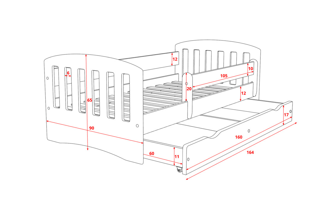 Lit enfant aux bords arrondis et peints avec des vernis certifiés, écologiques et sans danger pour les enfants. La barrière de sécurité utilisée dans le lit la nuit assurera le sommeil en toute sécurité de l'enfant, et pendant la journée, après son retrait, elle transformera le lit en canapé pour s'asseoir. Il est proposé en 3 tailles de couchage - 140x80 cm, 160x80 cm et 180x80 cm. Un spacieux tiroir à deux compartiments sur roulettes vous permettra de ranger literie, couvertures ou autres accessoires jeunesse, en prenant soin de l'utilisation optimale de l'espace dans la salle des jeunes. Couchages et dimensions : 140x80cm - L 144 x P 90 x H 65 cm 160x80cm - L 164 x P 90 x H 65 cm 180x80cm - L 184 x P 90 x H 65 cm Coloris : blanc alpin Matériaux : Bois Européen Certifié FSC Le bois utilisé est issu de forets gérées de façon durable et responsable ! Panneaux de stratifiés 18 mm d’épaisseur - Vernis 3 fois Sommier en lattes de bouleau inclus Tiroir de rangement : en option ne peut pas accueillir de matelas Sécurité : Barrière de sécurité amovible Matelas en option : Matelas en mousse : mousse de polyuréthane de haute qualité de 8 cm d’épaisseur, housse amovible en tissu avec fermeture éclair La housse peut être lavée à une température allant jusqu'à 30°C. Charge maximale : 100 kg Fabriqué en Europe - Garantie 2 ans Conforme aux Normes de Sécurité Européennes Option(s) sélectionnée(s) : - Tiroirs : Sans tiroir - Couchage : 80x160 cm - Matelas : Sans matelas
