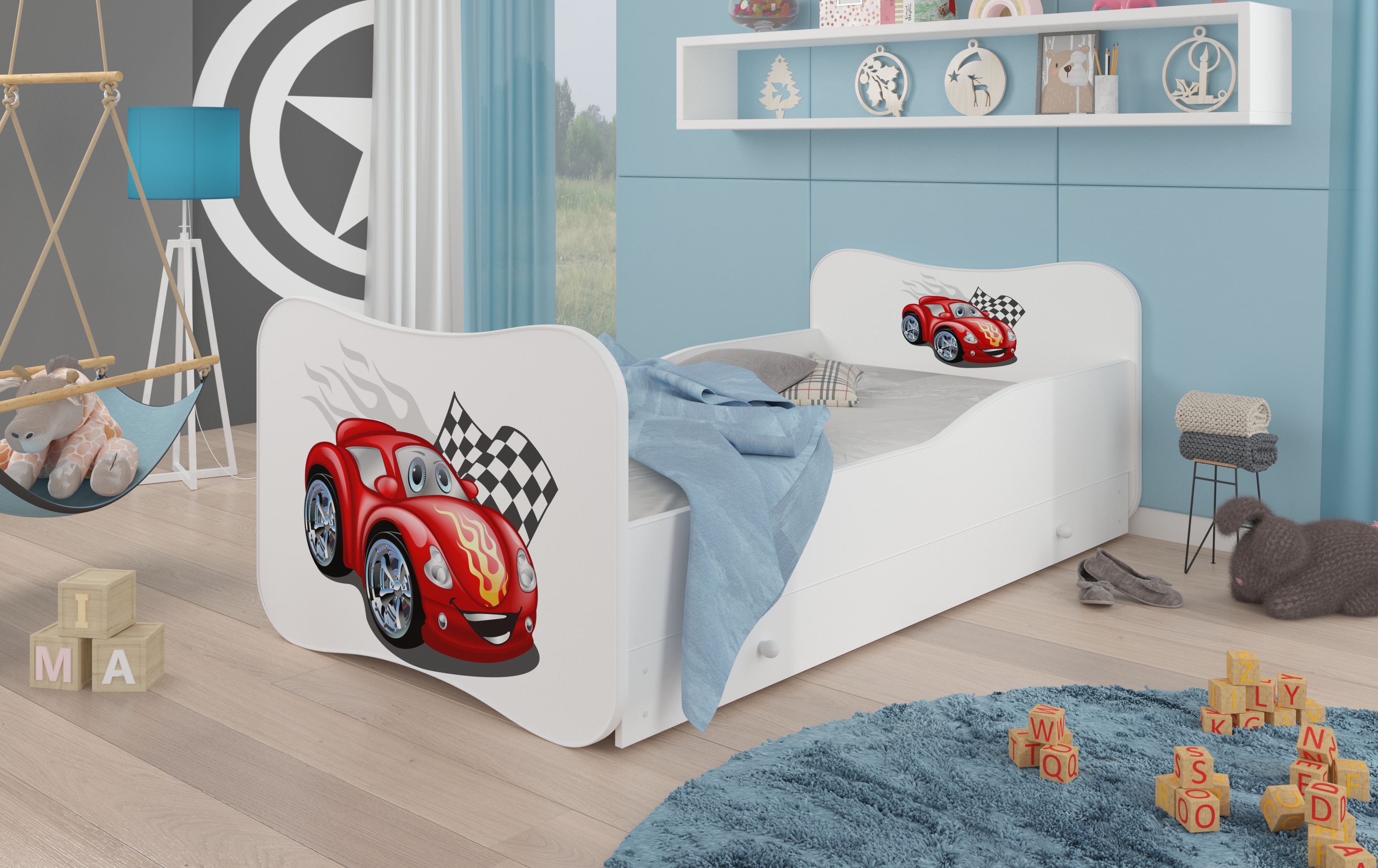 Lit enfant bois blanc à tiroirs avec imprimé voiture Cars 70x140 ou 80x160 - Sommier et matelas inclus -