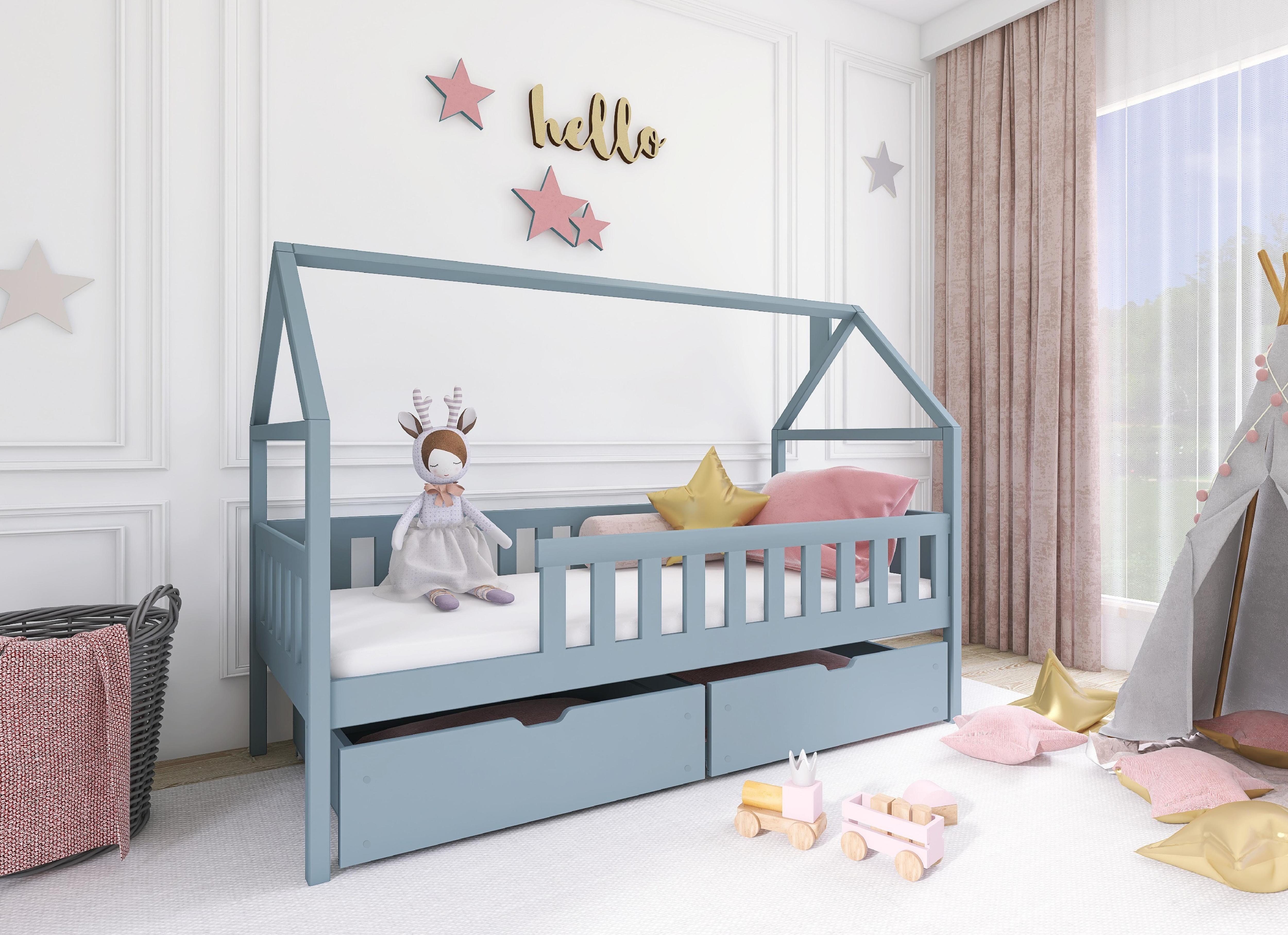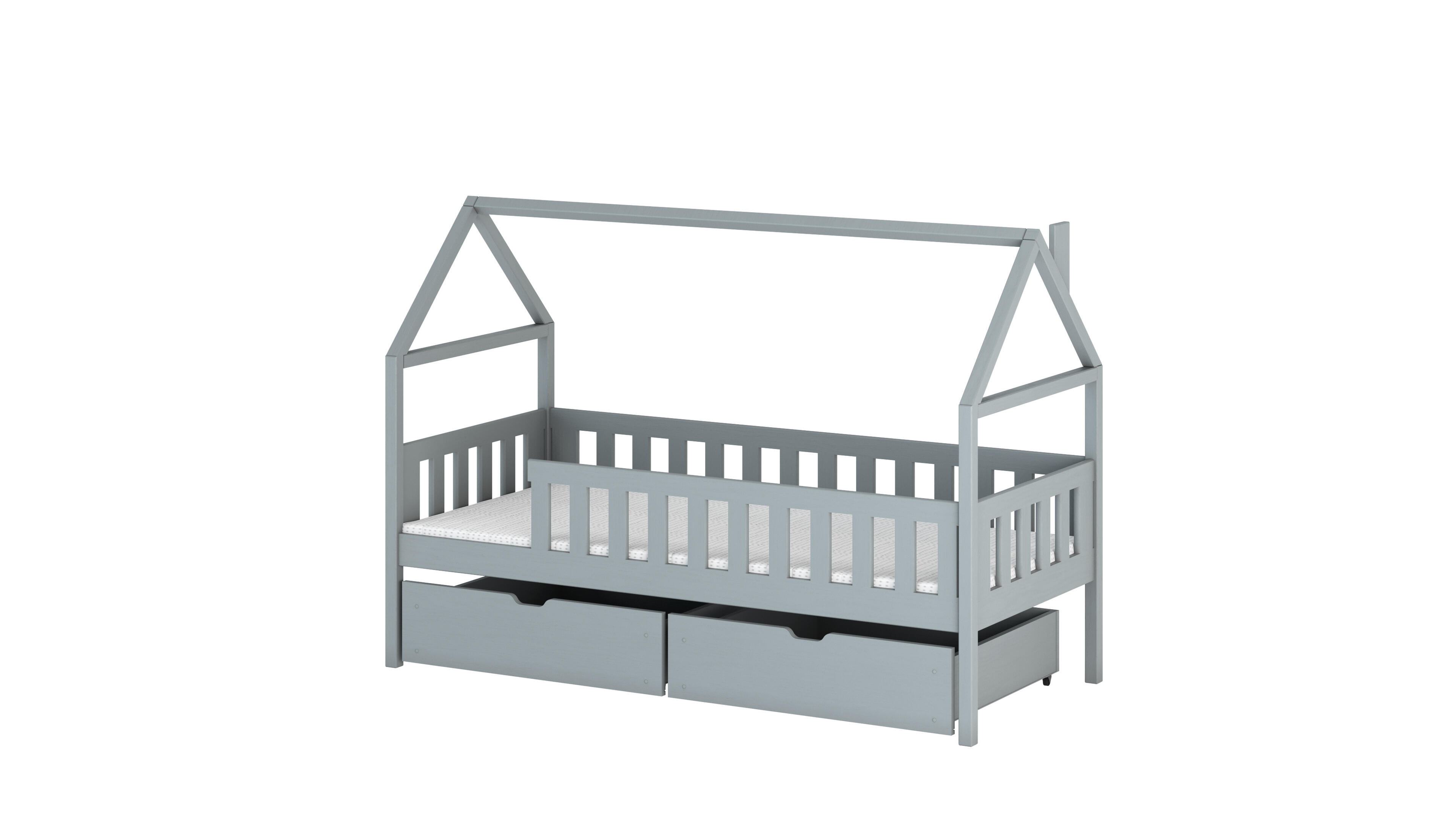 Le lit maison DOMI en gris offre un délicieux mélange de plaisir et de fonctionnalité. Ce lit est conçu avec un espace de couchage spacieux de 80x200cm. Fabriqué à partir de bois massif robuste, le cadre garantit durabilité et sécurité, résistant à une utilisation et à un jeu quotidiens. La structure en forme de maison du lit encourage non seulement le jeu imaginatif, mais comprend également deux tiroirs intégrés pour le rangement. Le design ludique et les caractéristiques pratiques du lit cabane DOMI en font un excellent choix pour créer un environnement de sommeil confortable et organisé pour votre enfant.