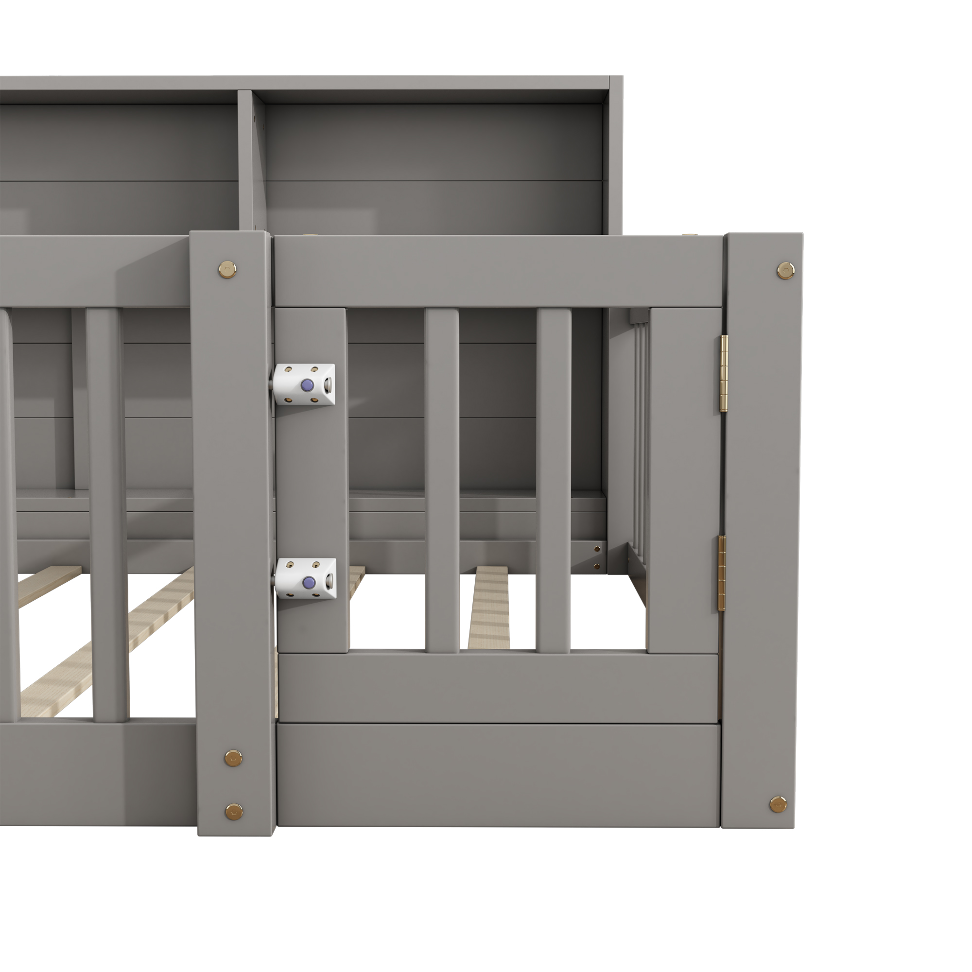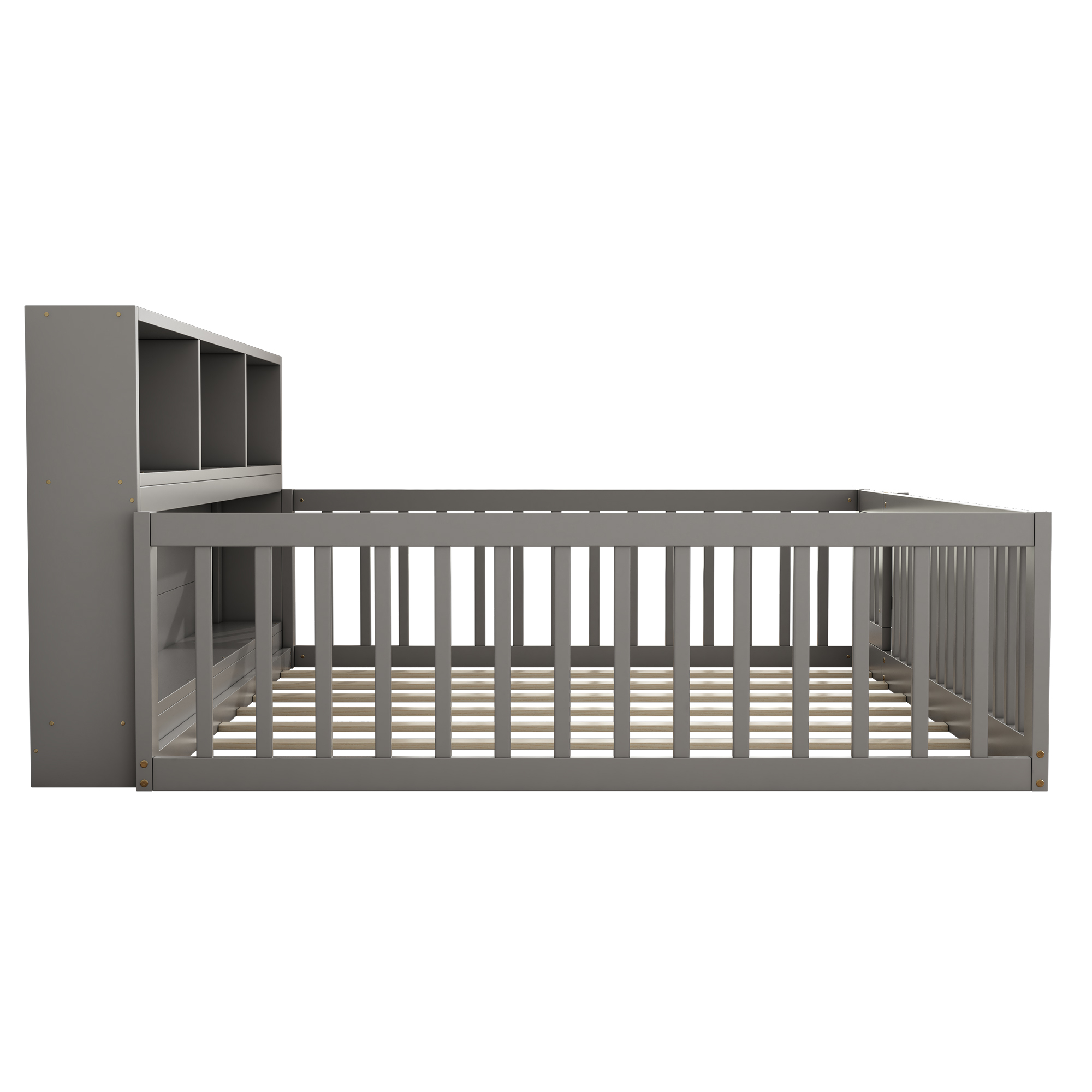 | Libellé | Lit Enfant Double au Sol 140x200cm avec Sommier et Étagères de Rangement, Barrières et Petite Porte, en Pin Gris, sans Matelas |