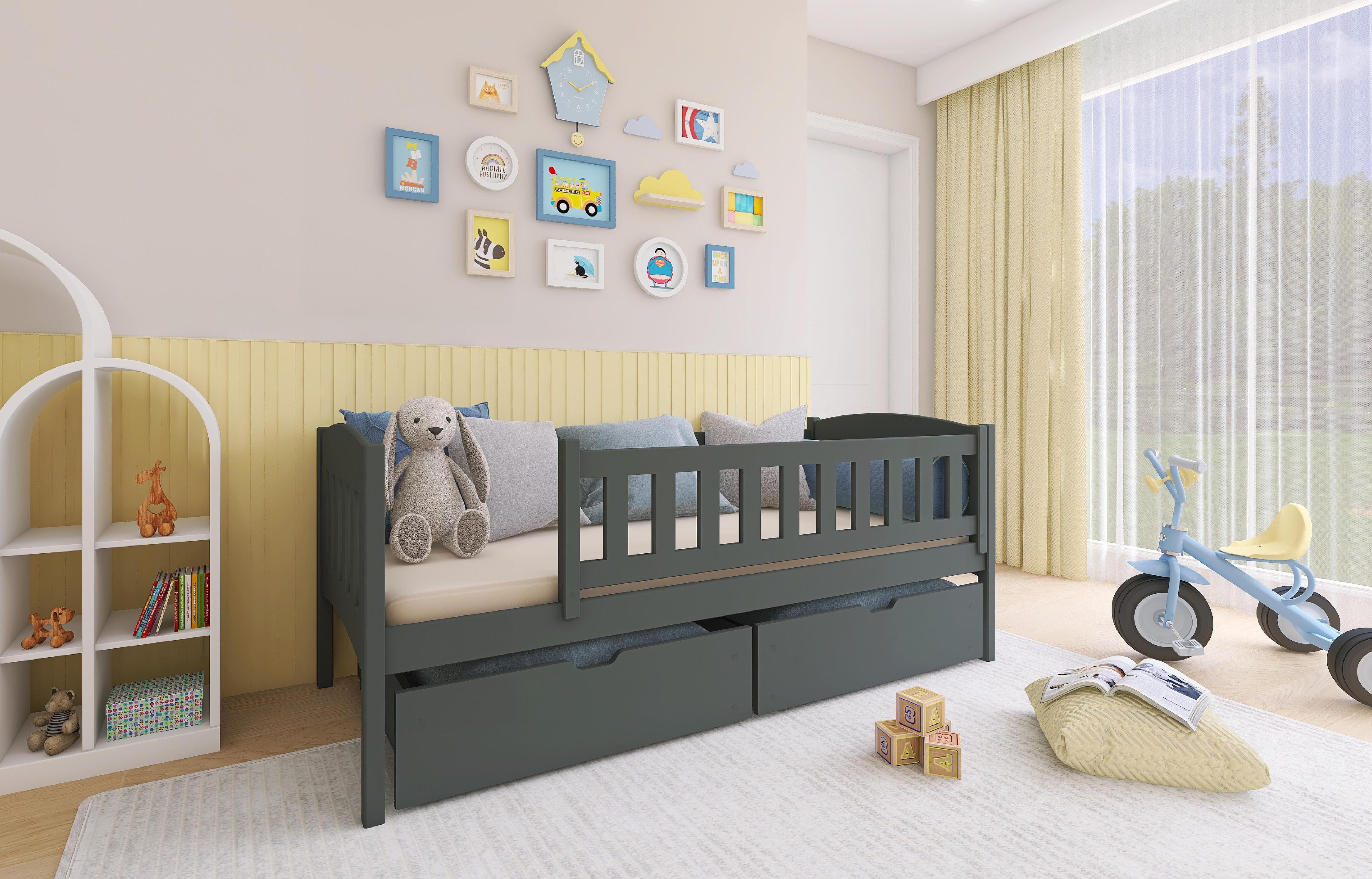 Le lit enfant GUCIO en graphite est un choix intelligent et élégant pour toute chambre d'enfant. Ce lit dispose d'un espace de couchage généreux de 90 x 180 cm, offrant suffisamment d'espace pour se reposer. Fabriqué avec un cadre en bois massif, le GUCIO est construit pour durer, garantissant durabilité et stabilité pendant des années d'utilisation. Sous la zone de couchage, deux grands tiroirs offrent des solutions de rangement pratiques pour les jouets, les livres ou la literie, contribuant ainsi à garder la pièce organisée et bien rangée. Le design élégant et la couleur du lit en font un choix parfait pour n'importe quel décor de pièce.