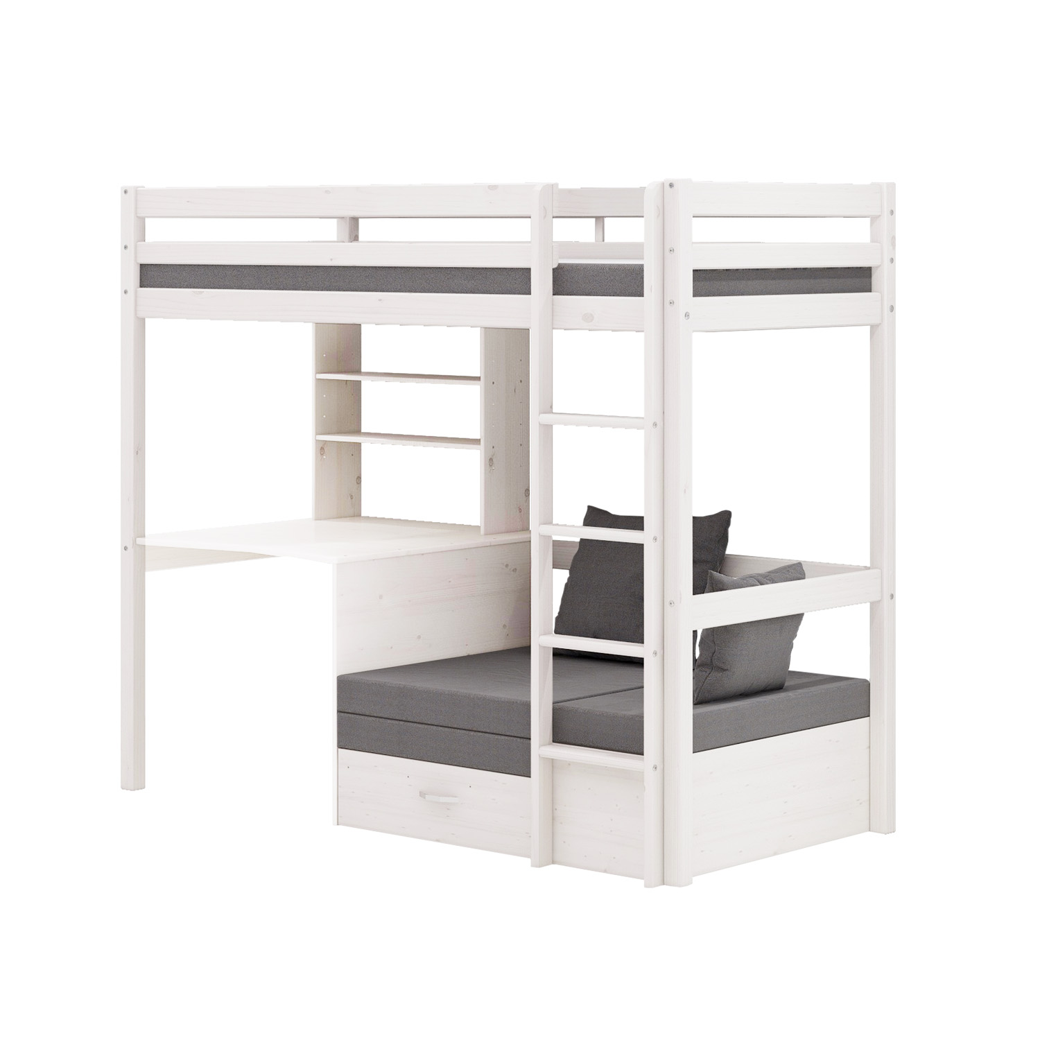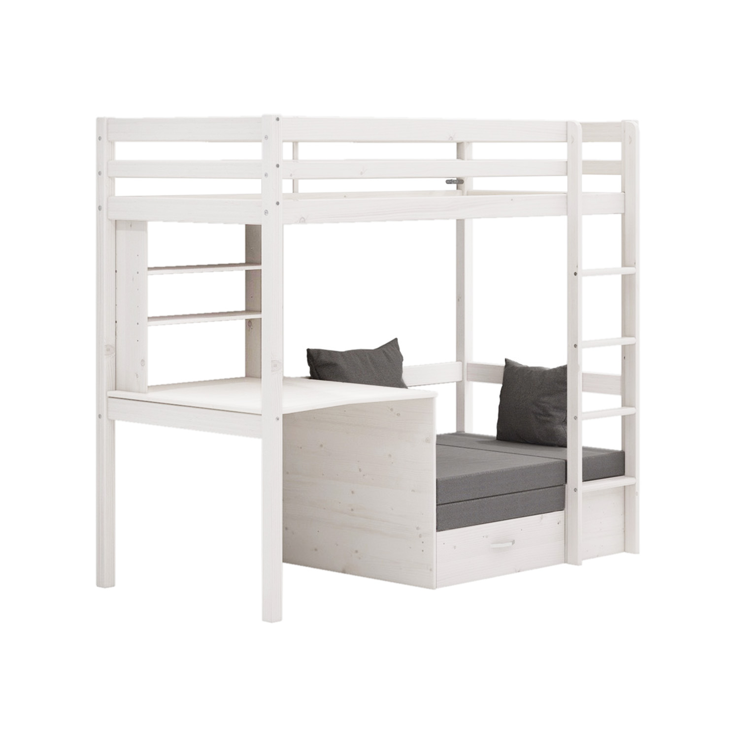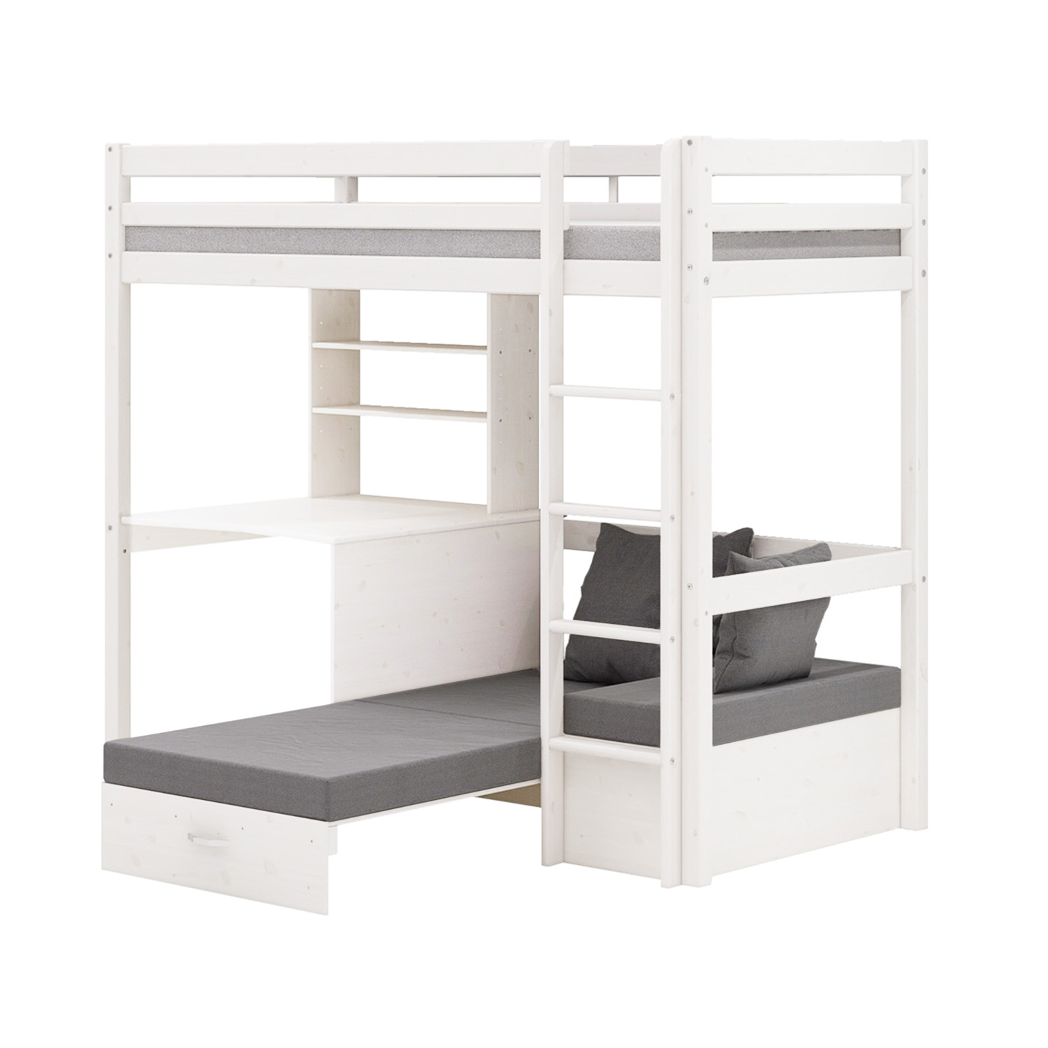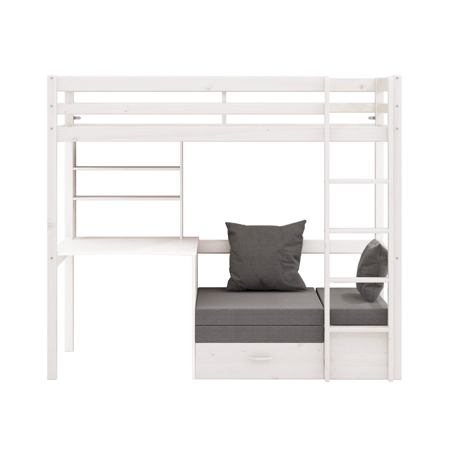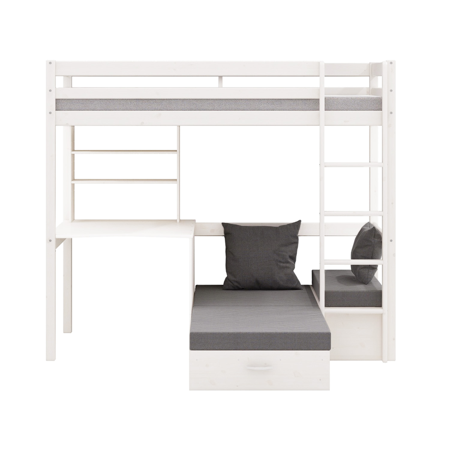 Lit mezzanine pour enfant avec canapé, bureau et bibliothèque blanc/gris clair est un lit pour enfant de couleur blanche qui apporte à la fois style et fonctionnalité à votre maison. Lit mezzanine Kids avec module canapé, lit d'appoint, bureau et bibliothèque. Le canapé est conçu pour que vous puissiez le retirer rapidement et facilement pour un espace de couchage supplémentaire. Vous décidez vous-même si le canapé, l'échelle ou le bureau doivent être placés à droite ou à gauche. Solution fonctionnelle, intelligente et peu encombrante. Sommier à lattes et matelas pour canapé, lit d'appoint inclus. 2 coussins décoratifs inclus. Sommier à lattes et matelas pour le lit supérieur, vous pouvez acheter sur cette page. Le lit surélevé est certifié EN747 par l'UE avec un sommier à lattes 27-82-30002 pour le lit supérieur. Profondeur hors échelle 98 cm. Profondeur avec échelle 104 cm. Profondeur du canapé allongé pour lit d'appoint 188 cm. Dimensions du matelas dessus de lit 90 x 200 cm (matelas et sommier non inclus). Dimensions du matelas canapé lit 188 x 75 cm (matelas et sommier à lattes inclus). Les pieds mesurent 5,5 cm x 5,5 cm. Bureau : Largeur - 86 cm, hauteur - 75 cm, profondeur - 95 cm. Espace ouvert à droite : Largeur - 86 cm, hauteur - 75 cm, profondeur - 95 cm. Ce produit est créé avec un souci du détail, ce qui garantit à la fois un attrait esthétique et une grande durabilité. Il est conçu dans un souci à la fois de fonctionnalité et de style, ce qui en fait le choix parfait pour n’importe quelle pièce de votre maison. Les matériaux utilisés sont de haute qualité, ce qui confère au produit une longue durée de vie et lui permet de résister à une utilisation quotidienne. Que ce soit pour le rangement ou comme ajout décoratif, ce produit rehaussera votre décor et apportera plus de confort et d'élégance à votre maison.