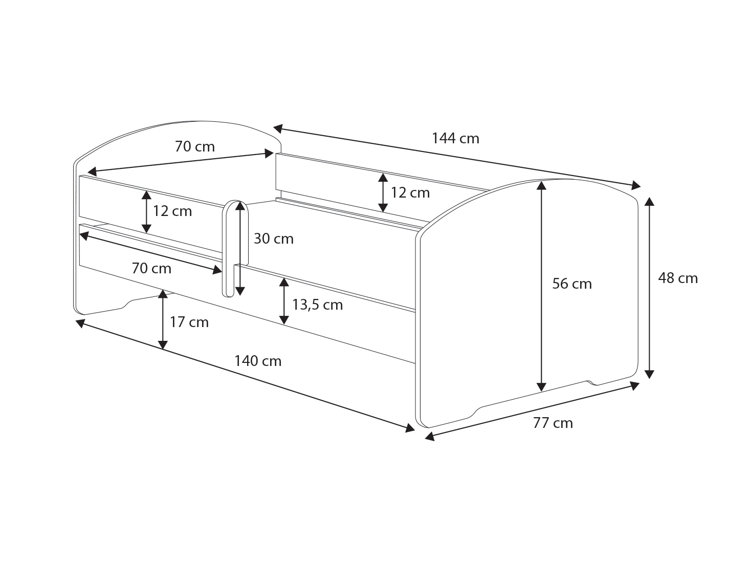 • dimensions du lit : 144 cm x 77 cm x 56 cm, coin nuit : 140 cm x 70 cm, lit adapté pour un matelas de dimensions : 140 cm x 70 cm x 7 cm,