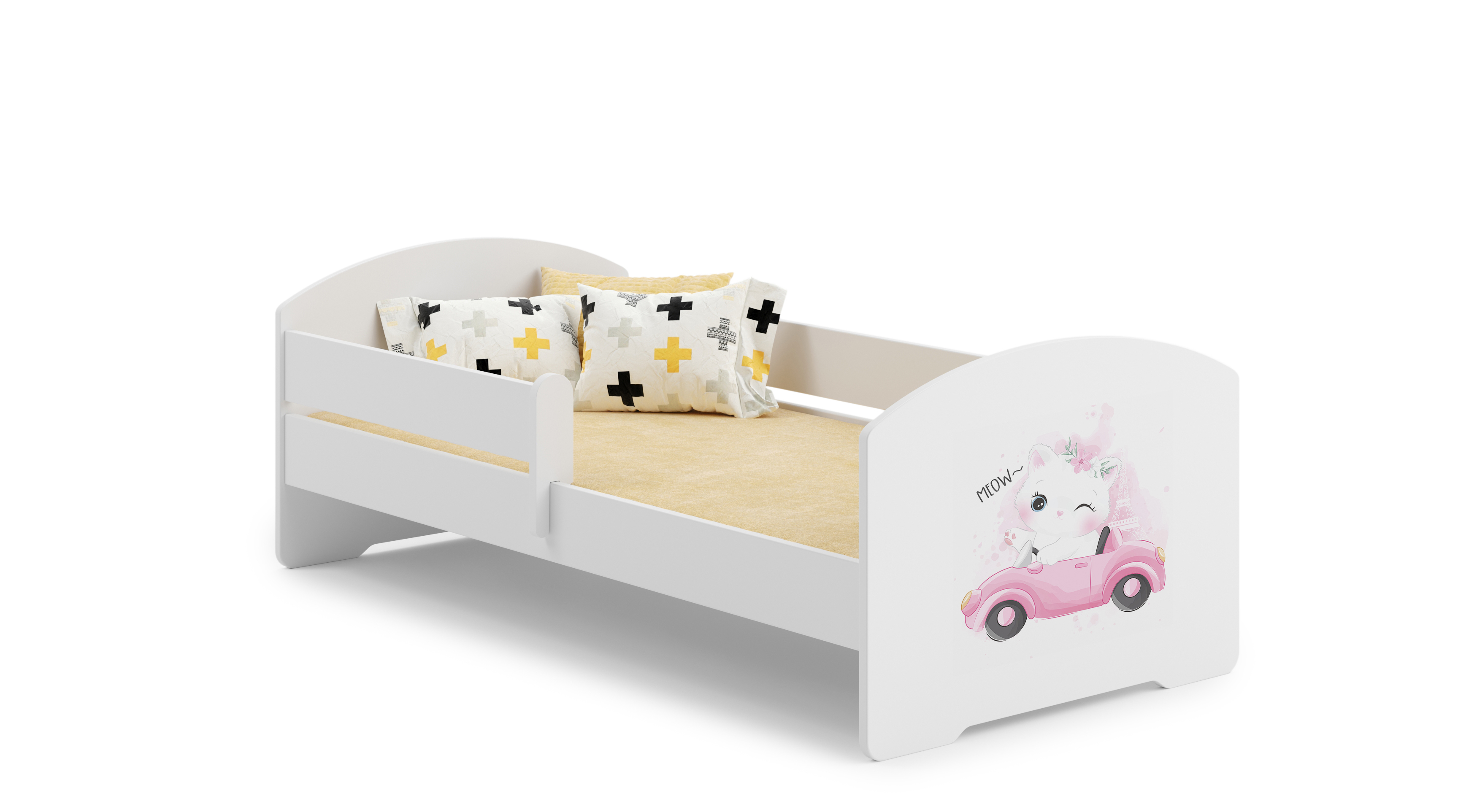 Lit enfant avec matelas, barrière de protection universelle. Il est possible de monter la barrière de protection sur le côté droit ou gauche. Dimension du lit, longueur 144 cm, largeur 77 cm, hauteur 56 cm. Coin couchage 140 cm x 70 cm. Matelas en mousse avec housse déhoussable. Dimensions : 140 cm x 70 cm x 7 cm. Les bords du lit sont finis avec des bordures en PVC / ABS, qui protègent largement contre les dommages mécaniques. Sommier de lit est composé de lattes à ressort dans le système FLEX, charge maximale jusqu'à 110 kg. L'ensemble comprend un matelas , sommier et lit. Les frais de livraison n'incluent pas la fourniture du mobilier de l'appartement ou son montage. Des instructions de montage claires sont incluses. Nos lits sont livrés en 2 colis avec des pièces à monter soi-même.