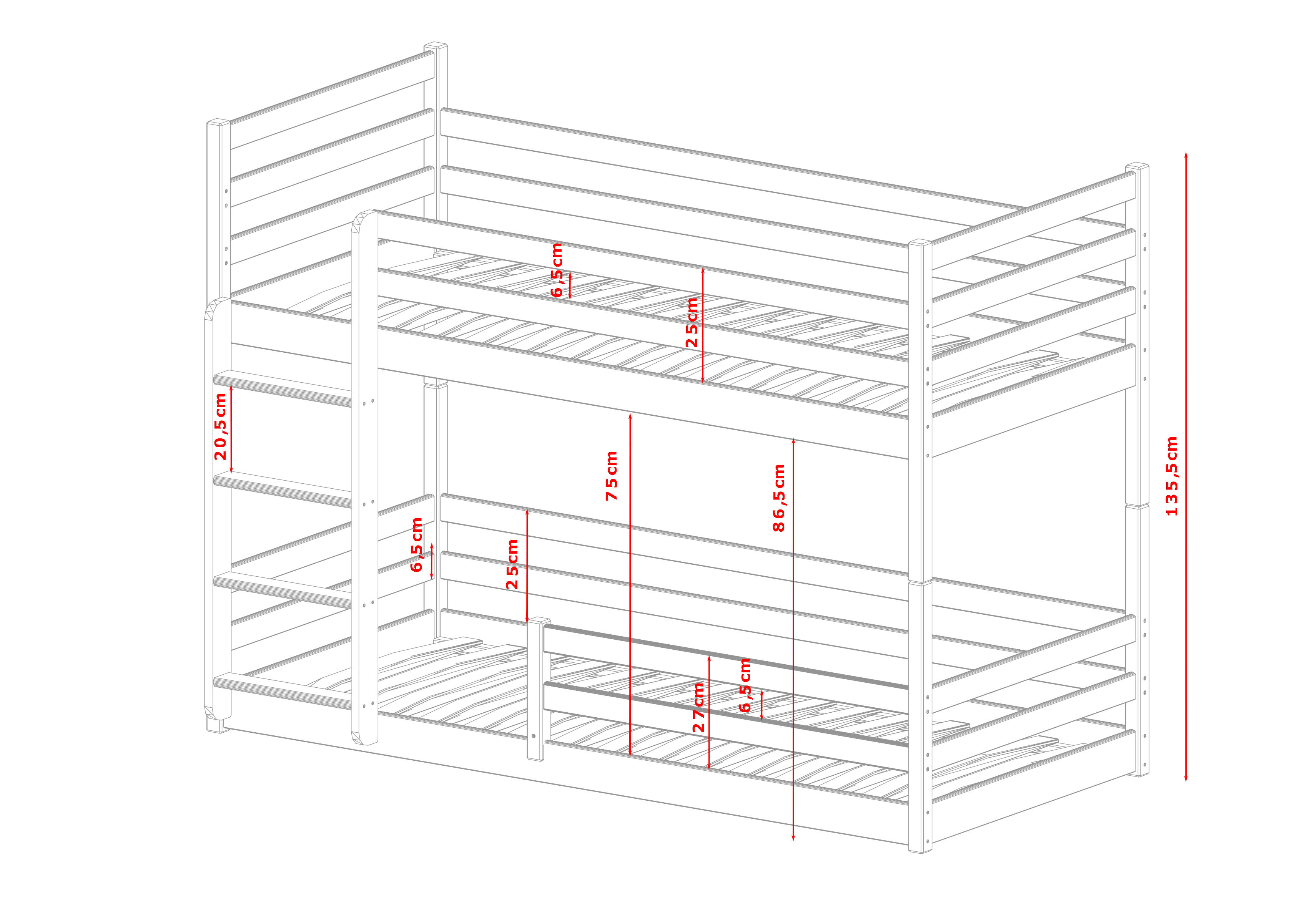 Le lit superposé MINI, fini en beige, offre une solution de couchage sûre et élégante pour les enfants. Avec sa construction robuste en bois massif, ce lit superposé offre une structure fiable. Chaque couchette dispose d'un espace de couchage spacieux de 90 x 180 cm, celui du bas étant conçu près du sol pour garantir un accès facile aux enfants et renforcer la sécurité. Le lit superposé MINI est un excellent choix pour optimiser l'espace sans sacrifier le confort ou la sécurité.