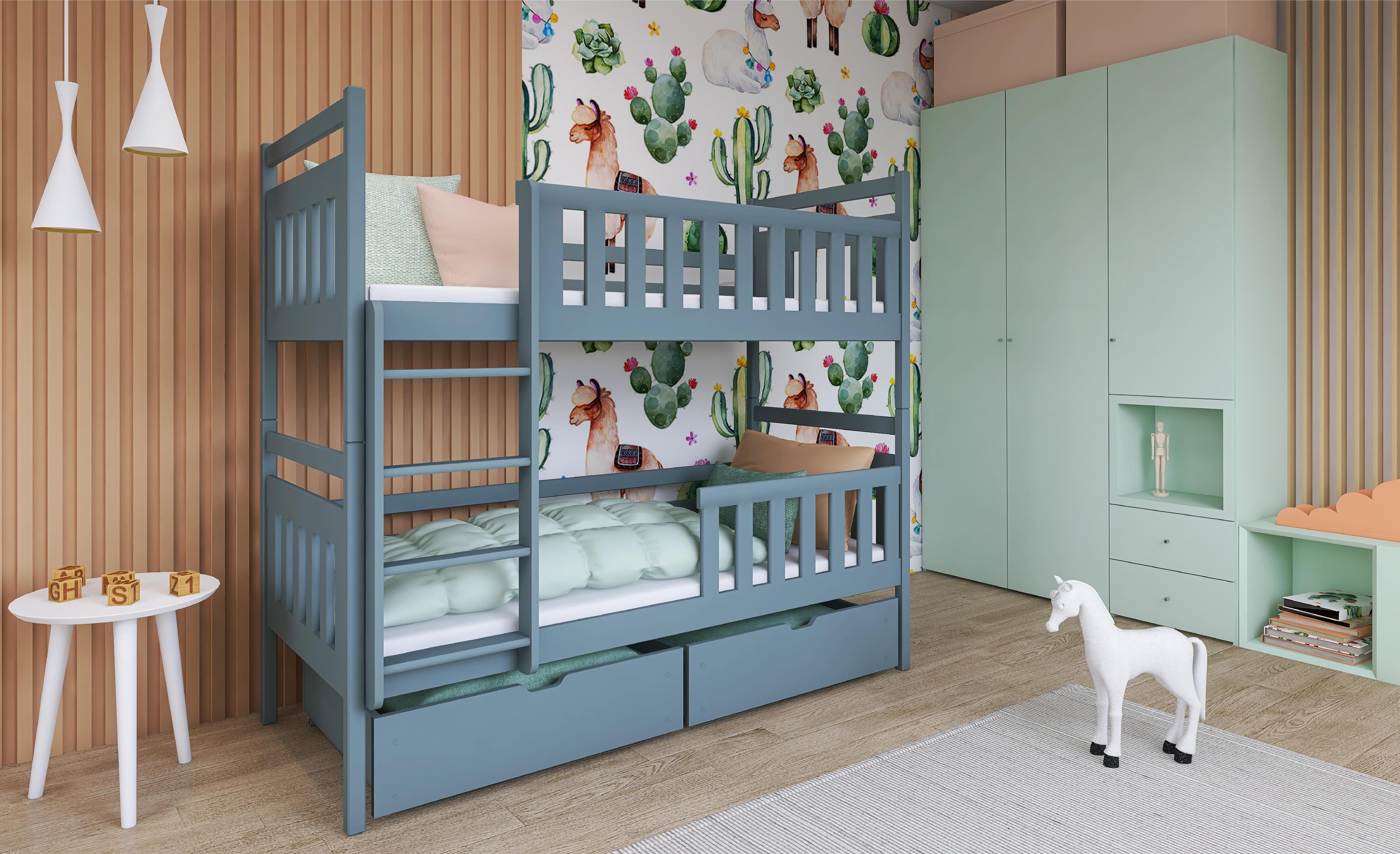 Le lit superposé MONIKA en Gris est une pièce astucieusement conçue. Ce lit dispose de deux espaces de couchage spacieux de 80 x 180 cm, idéaux pour les frères et sœurs ou les soirées pyjama. Construit en bois massif, il assure une stabilité et une sécurité durables. Le lit est équipé de deux tiroirs situés sous le lit superposé inférieur, offrant un espace de rangement essentiel pour la literie, les vêtements ou les jouets, gardant ainsi la pièce bien rangée. Le lit superposé MONIKA maximise efficacement l'espace vertical, ce qui en fait un ajout pratique à toute chambre d'enfant.