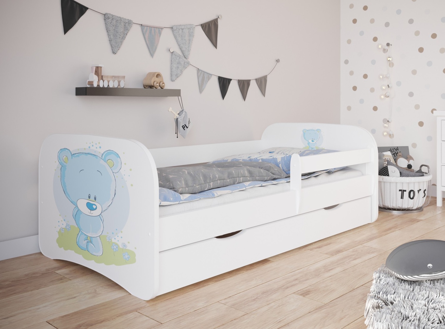Ce lit enfant livré avec un sommiers à lattes et une barrière de sécurité est idéale pour une transition entre le lit bébé et un lit d'enfant. Votre enfant sera ravi par ce modele qui se distingue par un graphisme nounours. 3 couchages sont disponibles : 70x140 ou 80x160 ou 80x180 cm Couchages et dimensions : 140x70cm - L 144 x P 80 x H 61 cm 160x80cm - L 164 x P 90 x H 61 cm 180x80cm - L 184 x P 90 x H 61 cm Coloris : blanc alpin Les façades des lits ont un graphisme durable et résistant au nettoyage. Matériaux : Bois Européen Certifié FSC Le bois utilisé est issu de forets gérées de façon durable et responsable ! Panneaux de stratifiés 18 mm d’épaisseur Sommier en lattes de bouleau inclus Composées de lattes de bouleau lamellé-collé, profilées en arc léger, augmentant le confort et l'élasticité du matelas, elles assurent un soutien et une ventilation adéquats du matelas. Résine des deux côtés Il se compose d'une rangée de lattes fixées avec des bandes synthétiques à haute résistance, qui garantissent une répartition uniforme et durable des lattes sur le sommier. L'ensemble comprend des couvercles en plastique pour les bandes anti-grincement et les accessoires de montage Tiroir de rangement : en option ne peut pas accueillir de matelas Vernis 3 fois Sécurité : Barrière de sécurité amovible Matelas en option : Matelas en mousse : mousse de polyuréthane de haute qualité de 8 cm d’épaisseur, housse amovible en tissu avec fermeture éclair Charge maximale : 120 kg Fabriqué en Europe - Garantie 2 ans Conforme aux Normes de Sécurité Européennes Option(s) sélectionnée(s) : - Tiroirs : Sans tiroir - Couchage : 70x140 cm - Matelas : Matelas mousse