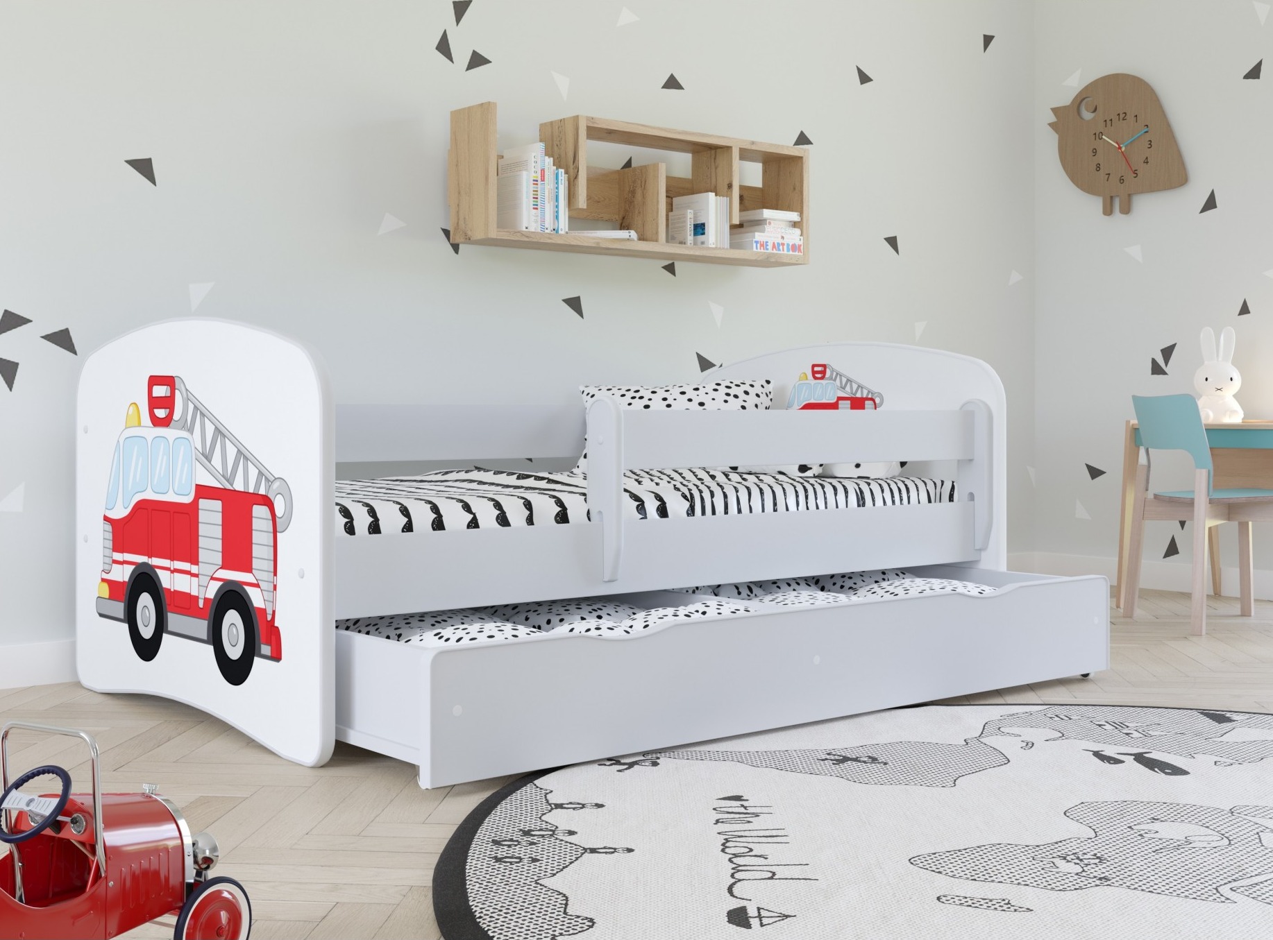 Ce lit enfant livré avec un sommiers à lattes et une barrière de sécurité est idéale pour une transition entre le lit bébé et un lit d'enfant. Votre enfant sera ravi par ce modele qui se distingue par un graphisme petit dinosaure. 3 couchages sont disponibles : 70x140 ou 80x160 ou 80x180 cm Couchages et dimensions : 140x70cm - L 144 x P 80 x H 61 cm 160x80cm - L 164 x P 90 x H 61 cm 180x80cm - L 184 x P 90 x H 61 cm Coloris : blanc alpin Les façades des lits ont un graphisme durable et résistant au nettoyage. Matériaux : Bois Européen Certifié FSC Le bois utilisé est issu de forets gérées de façon durable et responsable ! Panneaux de stratifiés 18 mm d’épaisseur Sommier en lattes de bouleau inclus Composées de lattes de bouleau lamellé-collé, profilées en arc léger, augmentant le confort et l'élasticité du matelas, elles assurent un soutien et une ventilation adéquats du matelas. Résine des deux côtés Il se compose d'une rangée de lattes fixées avec des bandes synthétiques à haute résistance, qui garantissent une répartition uniforme et durable des lattes sur le sommier. L'ensemble comprend des couvercles en plastique pour les bandes anti-grincement et les accessoires de montage Tiroir de rangement : en option ne peut pas accueillir de matelas Vernis 3 fois Sécurité : Barrière de sécurité amovible Matelas en option : Matelas en mousse : mousse de polyuréthane de haute qualité de 8 cm d’épaisseur, housse amovible en tissu avec fermeture éclair Charge maximale : 120 kg Fabriqué en Europe - Garantie 2 ans Conforme aux Normes de Sécurité Européennes Option(s) sélectionnée(s) : - Tiroirs : Sans tiroir - Couchage : 70x140 cm - Matelas : Matelas mousse