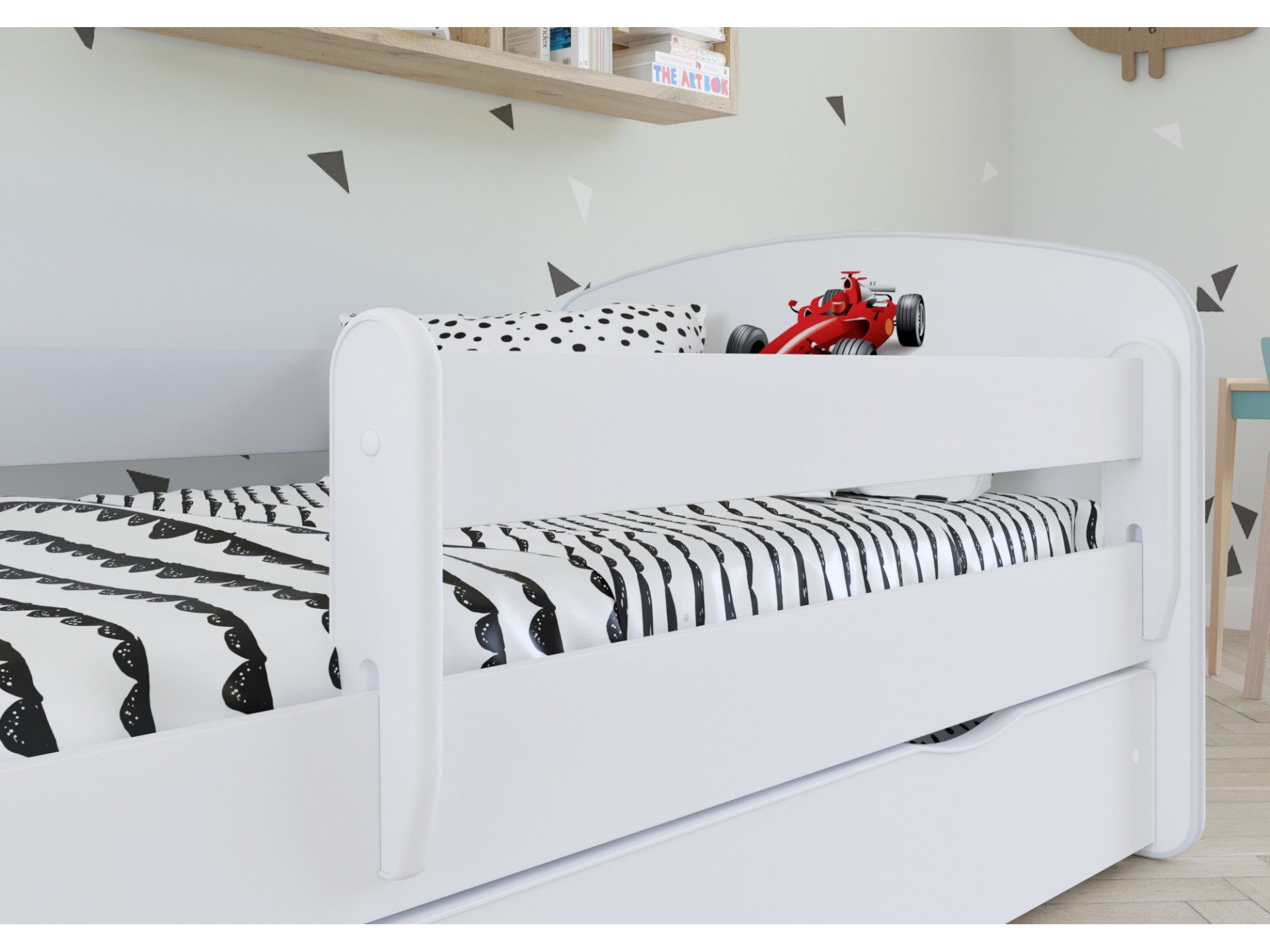 Ce lit enfant blanc et rose livré avec un sommiers à lattes et une barrière de sécurité est idéale pour une transition entre le lit bébé et un lit d'enfant. Votre enfant sera ravi par ce modele qui se distingue par un graphisme d'une princesse debout à coté de son cheval. 3 couchages sont disponibles : 70x140 ou 80x160 ou 80x180 cm Couchages et dimensions : 140x70cm - L 144 x P 80 x H 61 cm 160x80cm - L 164 x P 90 x H 61 cm 180x80cm - L 184 x P 90 x H 61 cm Coloris : blanc alpin et rose Les façades des lits ont un graphisme durable et résistant au nettoyage. Matériaux : Bois Européen Certifié FSC Le bois utilisé est issu de forets gérées de façon durable et responsable ! Panneaux de stratifiés 18 mm d’épaisseur Sommier en lattes de bouleau inclus Composées de lattes de bouleau lamellé-collé, profilées en arc léger, augmentant le confort et l'élasticité du matelas, elles assurent un soutien et une ventilation adéquats du matelas. Résine des deux côtés Il se compose d'une rangée de lattes fixées avec des bandes synthétiques à haute résistance, qui garantissent une répartition uniforme et durable des lattes sur le sommier. L'ensemble comprend des couvercles en plastique pour les bandes anti-grincement et les accessoires de montage Tiroir de rangement : en option ne peut pas accueillir de matelas Vernis 3 fois Sécurité : Barrière de sécurité amovible Matelas en option : Matelas en mousse : mousse de polyuréthane de haute qualité de 8 cm d’épaisseur, housse amovible en tissu avec fermeture éclair Charge maximale : 120 kg Fabriqué en Europe - Garantie 2 ans Conforme aux Normes de Sécurité Européennes Option(s) sélectionnée(s) : - Couchage : 80x160 cm - Matelas : Matelas mousse - Tiroirs : Sans tiroir