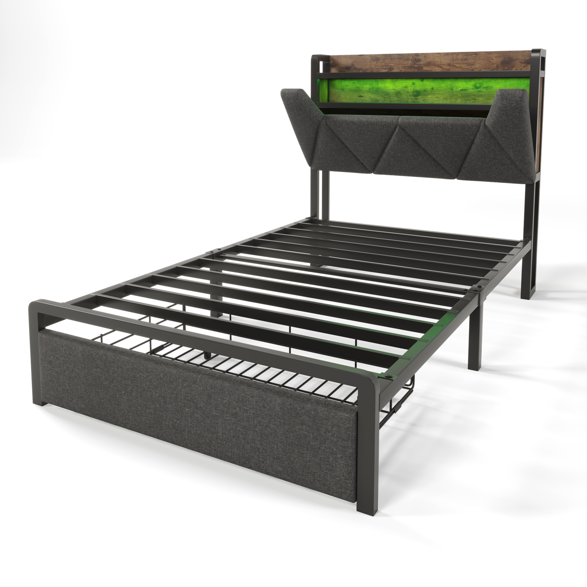 Le cadre de lit met en valeur un élégant tête de lit équipé d'un système d'éclairage LED personnalisable, offrant une multitude de couleurs et d'effets lumineux pour créer l'ambiance parfaite. Son design industriel allie avec harmonie le bois rustique et les accents métalliques, tandis que la télécommande et l'application mobile permettent un contrôle précis de la luminosité, des effets clignotants et des minuteries pour une expérience immersive.