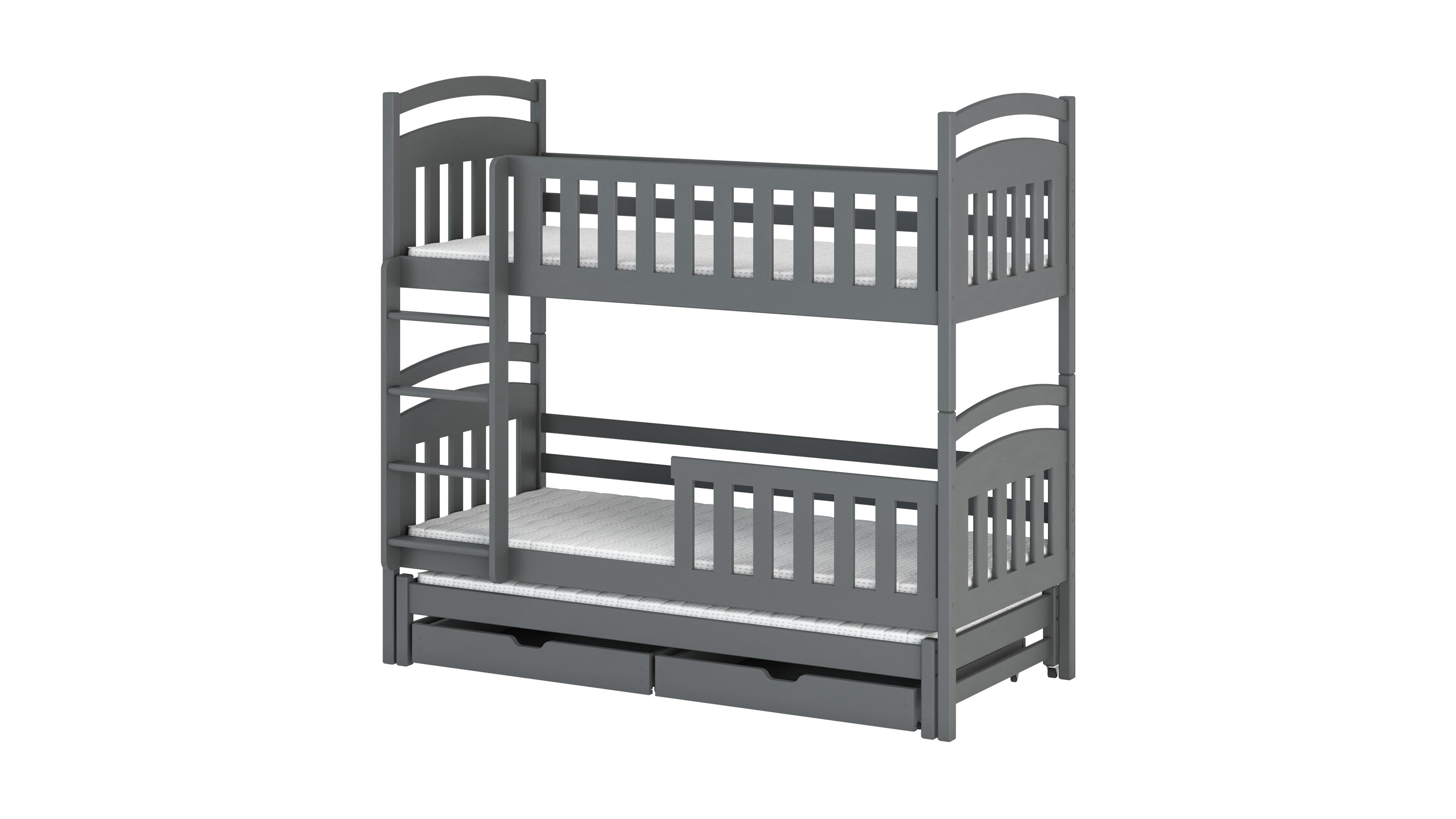 Le lit superposé VIKI est une solution idéale pour les chambres d'enfants, disponible en Graphite. Son couchage généreux de 80x190cm vous assure confort et espace. Fabriqué avec un cadre en bois massif durable, il offre stabilité et fiabilité pour les années à venir. Le lit gigogne offre une polyvalence pour les soirées pyjama ou pour accueillir des invités, tandis que les deux tiroirs pratiques situés en dessous offrent suffisamment de rangement. Avec sa combinaison de fonctionnalité et de design contemporain, le lit superposé VIKI est un choix élégant et pratique pour toute chambre d'enfant.