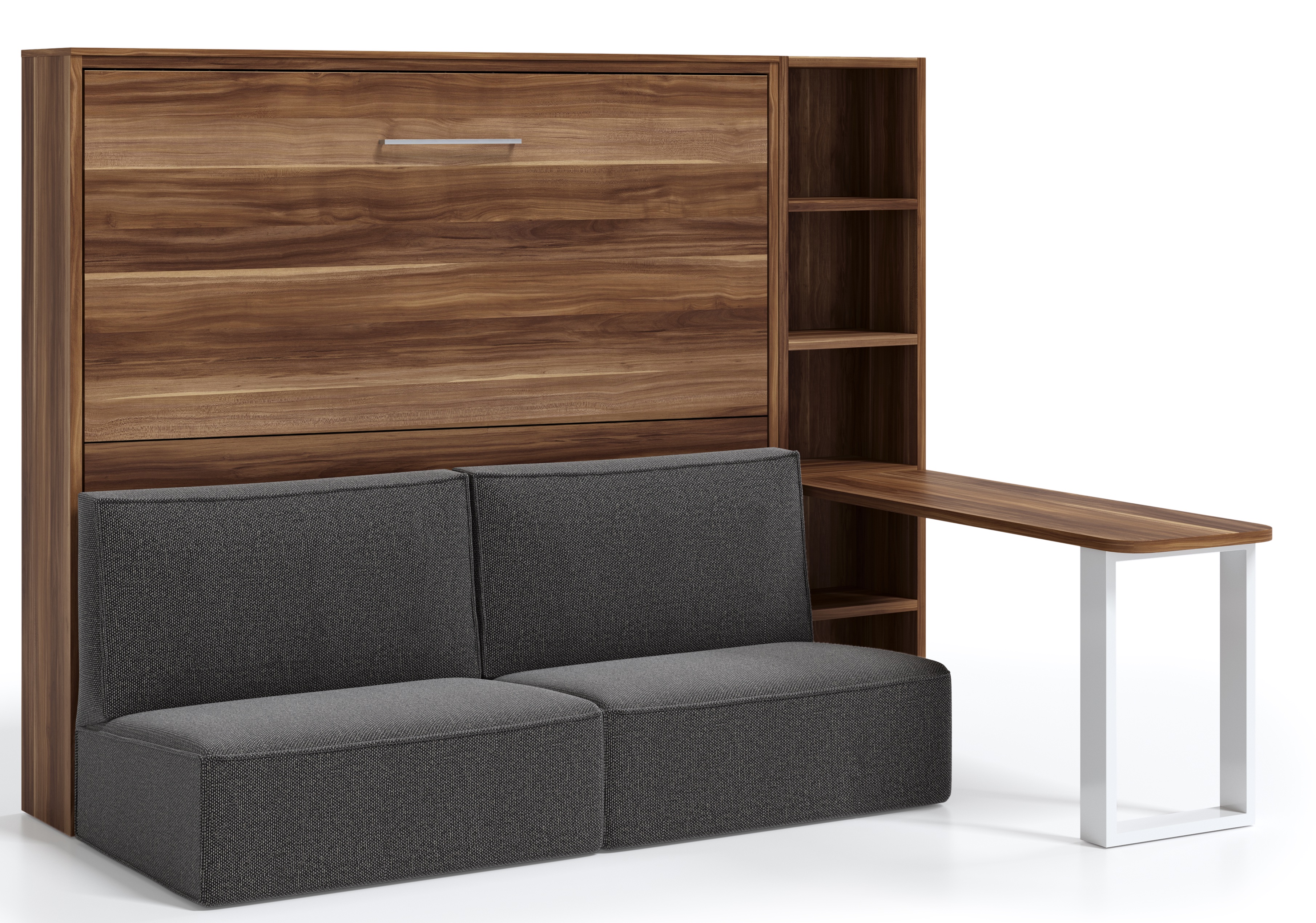 Explorez notre offre haut de gamme spécialement conçue pour la location meublée : le lit escamotable horizontal avec canapé en tissu, accompagné en option d'une étagère que vous pouvez installer à gauche ou à droite de l'armoire lit, ainsi que d'un bureau. Une solution pratique et optimisée pour maximiser l'utilisation de votre espace de vie. Avec une taille de couchage généreuse de 120x200 cm et une palette étendue de choix de coloris pour les meubles et les canapés, notre lit escamotable s'adapte parfaitement à toutes les situations. Fabriqué avec des panneaux en mélamine haute densité, notre lit escamotable se distingue par une finition extérieure de 30 mm et une finition intérieure de 20 mm, garantissant une solidité à toute épreuve. L'ouverture relevable s'effectue en toute simplicité grâce à notre système de guides actionnés par des ressorts à gaz hydrauliques. Les amortisseurs à gaz assurent une descente lente et sécurisée du lit, permettant une utilisation quotidienne sans effort. Le système de sécurité anti-roulis et anti-blocage, intégré dans les ressorts hydrauliques lorsque la couchette est en position fermée, offre une tranquillité d'esprit optimale. La structure en tube d'acier renforcée, associée à des panneaux de particules de mélamine haute densité, garantit une stabilité à long terme. Le canapé en tissu 100% polyester traité antitaches TEFLON, au grain fin et au tissage serré, vous assure une grande résistance aux aléas du quotidien. Avec notre lit escamotable horizontal avec canapé en tissu, vous bénéficiez d'un espace de vie confortable, pratique et facile à utiliser. Les normes élevées de fabrication et les innovations techniques font de cette armoire lit escamotable un véritable atout. Les vérins à gaz longue durée permettent une ouverture et une fermeture silencieuses, adaptées également aux personnes âgées. Le sommier à lattes intégré, doté d'un cadre métallique, est équipé d'un support répondant aux exigences les plus élevées. Couchage : 120 x 200 cm Armoire lit fermé avec canapé : L 214 x H 159 x P 104.5 cm Armoire lit fermé sans canapé : L 214 x H 159 x P 34.5 cm Armoire lit ouvert avec canapé : L 214 x H 159 x P 161 cm Armoire lit fermé avec canapé fermé avec canapé et étagère: L 263 x H 159 x P 104.5 cm Armoire lit ouvert avec canapé ouvert avec canapé et étagère: L 263 x H 159 x P 161 cm Canapé haut de gamme : L 214 x P 70 x H 92 cm Profondeur d'assise 60 cm - Assise H 42 cm - Hauteur du dossier 50 cm La bibliothèque : L 49 x P34.5 x H 159 cm Le bureau : L 140 x P 55 cm sont en option dans la même couleur que l'armoire lit sélectionnée. Hauteur du sommier : 30 cm Sommier inclus : Cadre métal époxy et 24 lattes de 5 cm en bouleau Poids supporté par le sommier : 220 kg Poignée : Acier inoxydable brossé 54 cm Matelas en Option :120x200 cm avec une épaisseur de 18 cm de hauteur très grande qualité de fabrication Européenne. Revêtement Strecht - Matelassage viscoélastique adaptable - Transpirable avec des fibres athermiques - Foam Eco Pur Gold - Hiper soft tedido 3D plus transpirable - Mousse 30 KG. HR - mousse visco 3 cm. Dimensions matelas recommandé : 120x200x22cm (18 cm de hauteur afin de laisser la couette). Informations techniques : Matière en panneau de MDF renforcé: Structure 35 mm pour la solidité et la façade du meuble 25 mm. Certifications LABEL - Bois Certifié PEFC - Garantie 10 ans Ouverture : système de vérins à gaz pour monter et descendre le lit rapidement et sans efforts. Piétement : Acier renforcé blanc, système de retournement manuel. Sécurité anti-basculement Pieds invisibles lorsque l’armoire lit est fermée Montage à deux personnes et fixations murales obligatoires (accroches fournies). Couleurs disponibles : Vous pouvez sur simple demande une couleur du meuble parmi les 12 couleurs de bois et sur plus de 18 coloris de tissu que nous vous proposons sur cette collection. Fabrication : Europe Garantie : 10 ans Option(s) sélectionnée(s) : - Etagère : Avec étagère - Bureau : Avec bureau - Canapé : Beige - Matelas : Sans matelas - Structure,Façade : Chêne clair