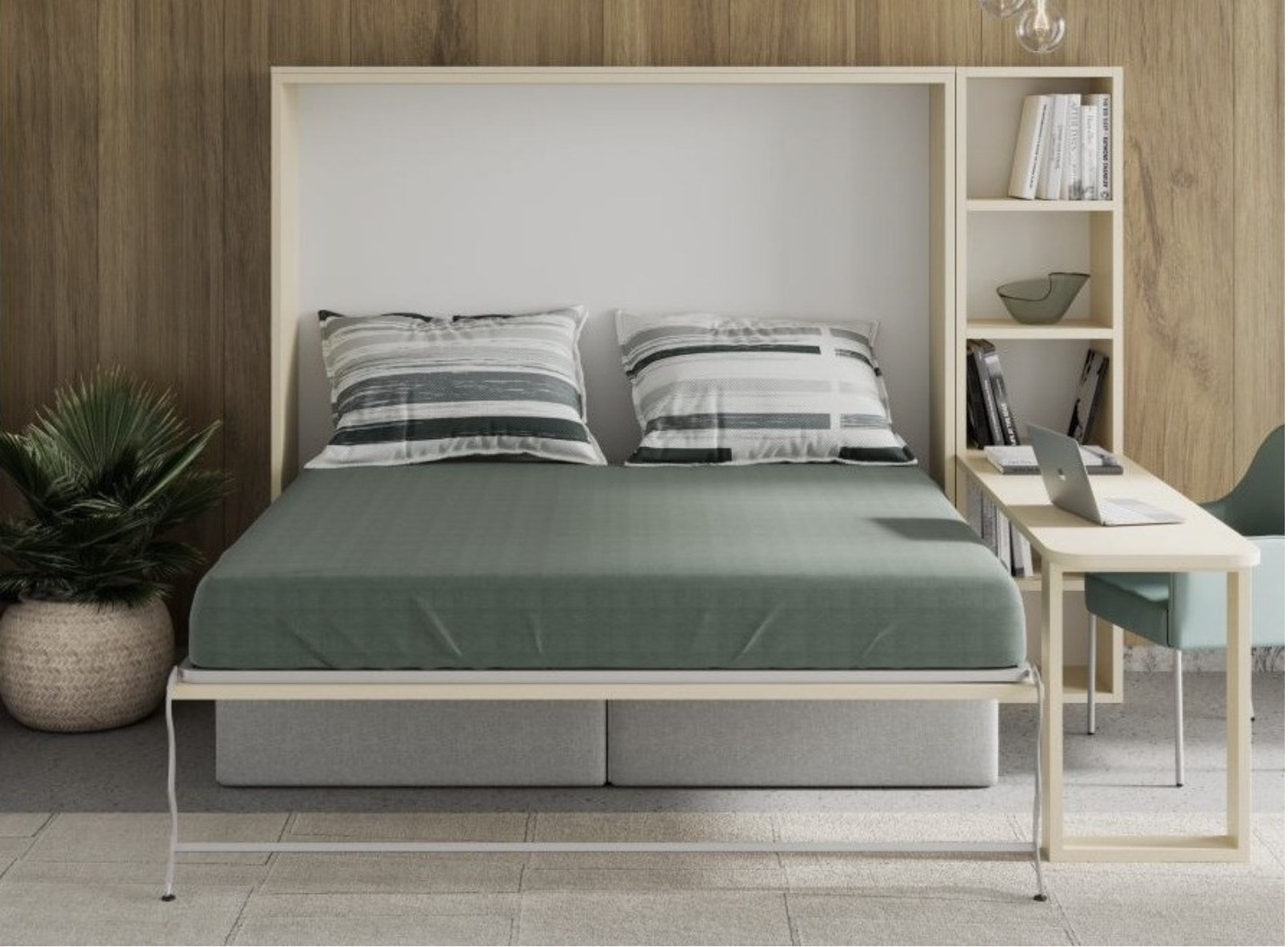Explorez notre offre haut de gamme spécialement conçue pour la location meublée : le lit escamotable horizontal avec canapé en tissu, accompagné en option d'une étagère que vous pouvez installer à gauche ou à droite de l'armoire lit, ainsi que d'un bureau. Une solution pratique et optimisée pour maximiser l'utilisation de votre espace de vie. Avec une taille de couchage généreuse de 160x200 cm et une palette étendue de choix de coloris pour les meubles et les canapés, notre lit escamotable s'adapte parfaitement à toutes les situations. Fabriqué avec des panneaux en mélamine haute densité, notre lit escamotable se distingue par une finition extérieure de 30 mm et une finition intérieure de 20 mm, garantissant une solidité à toute épreuve. L'ouverture relevable s'effectue en toute simplicité grâce à notre système de guides actionnés par des ressorts à gaz hydrauliques. Les amortisseurs à gaz assurent une descente lente et sécurisée du lit, permettant une utilisation quotidienne sans effort. Le système de sécurité anti-roulis et anti-blocage, intégré dans les ressorts hydrauliques lorsque la couchette est en position fermée, offre une tranquillité d'esprit optimale. La structure en tube d'acier renforcée, associée à des panneaux de particules de mélamine haute densité, garantit une stabilité à long terme. Le canapé en tissu 100% polyester traité antitaches TEFLON, au grain fin et au tissage serré, vous assure une grande résistance aux aléas du quotidien. Avec notre lit escamotable horizontal avec canapé en tissu, vous bénéficiez d'un espace de vie confortable, pratique et facile à utiliser. Les normes élevées de fabrication et les innovations techniques font de cette armoire lit escamotable un véritable atout. Les vérins à gaz longue durée permettent une ouverture et une fermeture silencieuses, adaptées également aux personnes âgées. Le sommier à lattes intégré, doté d'un cadre métallique, est équipé d'un support répondant aux exigences les plus élevées. Couchage : 160 x 200 cm Armoire lit fermé avec canapé : L 214 x H 199 x P 104.5 cm Armoire lit fermé sans canapé : L 214 x H 199 x P 34.5 cm Armoire lit ouvert avec canapé : L 214 x H 199 x P 181 cm Armoire lit fermé avec canapé fermé avec canapé et étagère: L 263 x H 199 x P 104.5 cm Armoire lit ouvert avec canapé ouvert avec canapé et étagère: L 263 x H 199 x P 161 cm Canapé haut de gamme : L 214 x P 70 x H 92 cm Profondeur d'assise 60 cm - Assise H 42 cm - Hauteur du dossier 50 cm La bibliothèque : L 49 x P34.5 x H 199 cm Le bureau : L 140 x P 55 cm sont en option dans la même couleur que l'armoire lit sélectionnée. Hauteur du sommier : 30 cm Sommier inclus : Cadre métal époxy et 24 lattes de 5 cm en bouleau Poids supporté par le sommier : 220 kg Poignée : Acier inoxydable brossé 54 cm Matelas en Option :160x200 cm avec une épaisseur de 18 cm de hauteur très grande qualité de fabrication Européenne. Revêtement Strecht - Matelassage viscoélastique adaptable - Transpirable avec des fibres athermiques - Foam Eco Pur Gold - Hiper soft tedido 3D plus transpirable - Mousse 30 KG. HR - mousse visco 3 cm. Dimensions matelas recommandé : 160x200x22cm (18 cm de hauteur afin de laisser la couette). Informations techniques : Matière en panneau de MDF renforcé: Structure 35 mm pour la solidité et la façade du meuble 25 mm. Certifications LABEL - Bois Certifié PEFC - Garantie 10 ans Ouverture : système de vérins à gaz pour monter et descendre le lit rapidement et sans efforts. Piétement : Acier renforcé blanc, système de retournement manuel. Sécurité anti-basculement Pieds invisibles lorsque l’armoire lit est fermée Montage à deux personnes et fixations murales obligatoires (accroches fournies). Couleurs disponibles : Vous pouvez sur simple demande une couleur du meuble parmi les 12 couleurs de bois et sur plus de 18 coloris de tissu que nous vous proposons sur cette collection. Fabrication : Europe Garantie : 10 ans Option(s) sélectionnée(s) : - Matelas : Sans matelas - Bureau : Avec bureau - Etagère : Avec étagère - Canapé : Gris clair - Structure,Façade : Gris ciment
