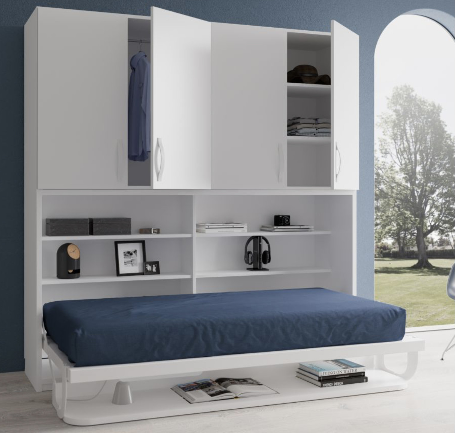 Le lit mural escamotable anthracite pour un couchage de 90/190 cm est proposé avec une tablette synchronisée et deux armoires en partie supérieure avec portes avec une profondeur de 34 cm. La tablette de travail reste parfaitement horizontale pendant l'ouverture de sorte que vous pouvez laisser vos affaires, ordinateur, verre, etc. sans vous inquiétez de devoir les enlever auparavant. Dimensions du lit escamotable : L 207 x H 214 x P 34 cm Couchage 90 x 190 cm Profondeur lit fermé: 34 cm Profondeur lit ouvert: 113 cm Epaisseur maximale du matelas en option 21 cm max Coloris : anthracite Armoire haute : Partie haute du rangement L 207 x H 98 x P 34 cm La partie rangement comprend deux espaces : un côté penderie avec une tringle incluse et un côté avec deux étagères de rangement, vous optimisez ainsi votre espace. Les étagères intérieures ne figurent que pour la version profondeur 53 cm. Pour une fonction penderie nous recommandons la version profondeur 53 Tablette bureau : P 35 cm x L 183 cm La tablette se déploie mécaniquement sans efforts Métal blanc mat Structure de l'armoire lit escamotable :? Panneaux de structure en mélaminé haute densité avec des finitions extérieures de 30 mm et des finitions intérieures de 20 mm.? Poignées métalliques finition chrome mat? Piétement métal brossé mat, système de retournement manuel. Forme de la plinthe: 10,5x1,5 cm?? Ouverture relevable au moyen d'un système de guides métalliques cachés activés par des ressorts à gaz.? Les amortisseurs à gaz assurent une descente lente sans danger, permettant au lit d'être rétracté sans effort.? Double système de sécurité anti-roulis et antiblocage avec le lit en position fermée Sommier inclus :? Fabriqué en bois multiplis Hauteur du sommier : 34 cm Installation / Montage : Il doit se faire à 2 personnes. Durée estimée environ 2 heures. Pour éviter tout risque de basculement, ce meuble doit obligatoirement être fixé à un support fixe à l’aide des équerres fournies. Les lits sont livrés avec des chevilles pour murs pleins. Pour les autres supports (mur creux, plaques de plâtre, bois...), utiliser un ensemble cheville/vis adapté. Fabriqué en Espagne Certifications label Bois Certifié PEFC - Garantie 10 ans - Norme CE