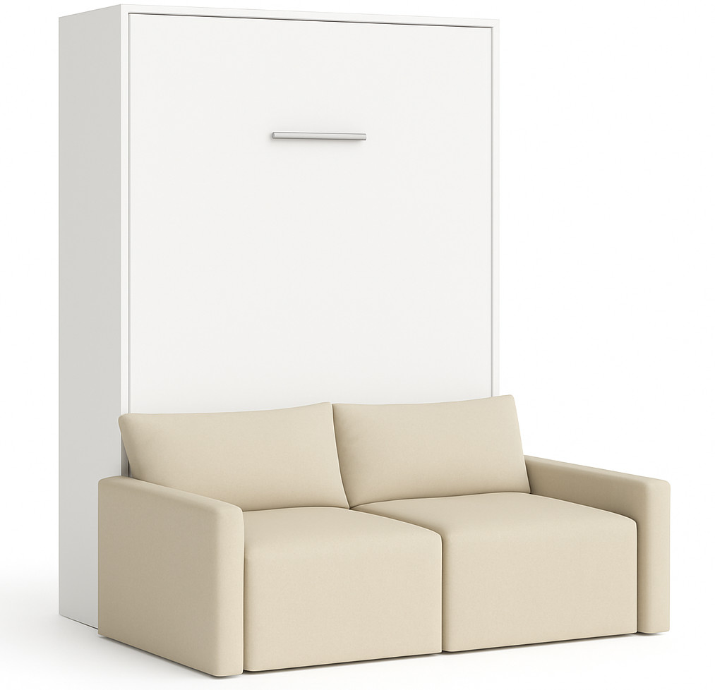 Lit escamotable vertical avec canapé tissu VALENCIA-Avec matelas-140x190-Canapé Beige-Structure Blanche