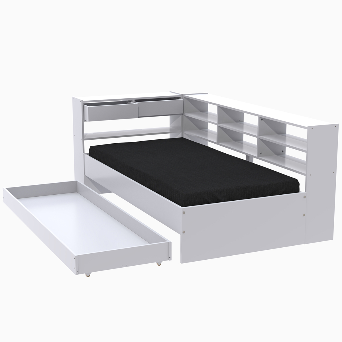 le lit 90x190 Roller est un lit doté d'un sommier, d'étagères et d'un tiroir de lit qui vous permettra d'optimiser l'espace dans la chambre de votre bambin.