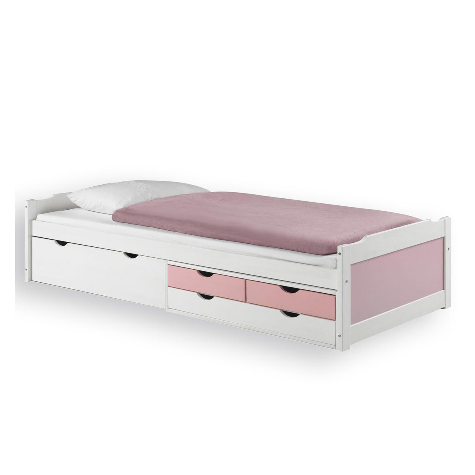 Lit fonctionnel ANDREA en pin massif lasuré blanc et rose 90 x 200 cm, lit pour enfant avec rangement