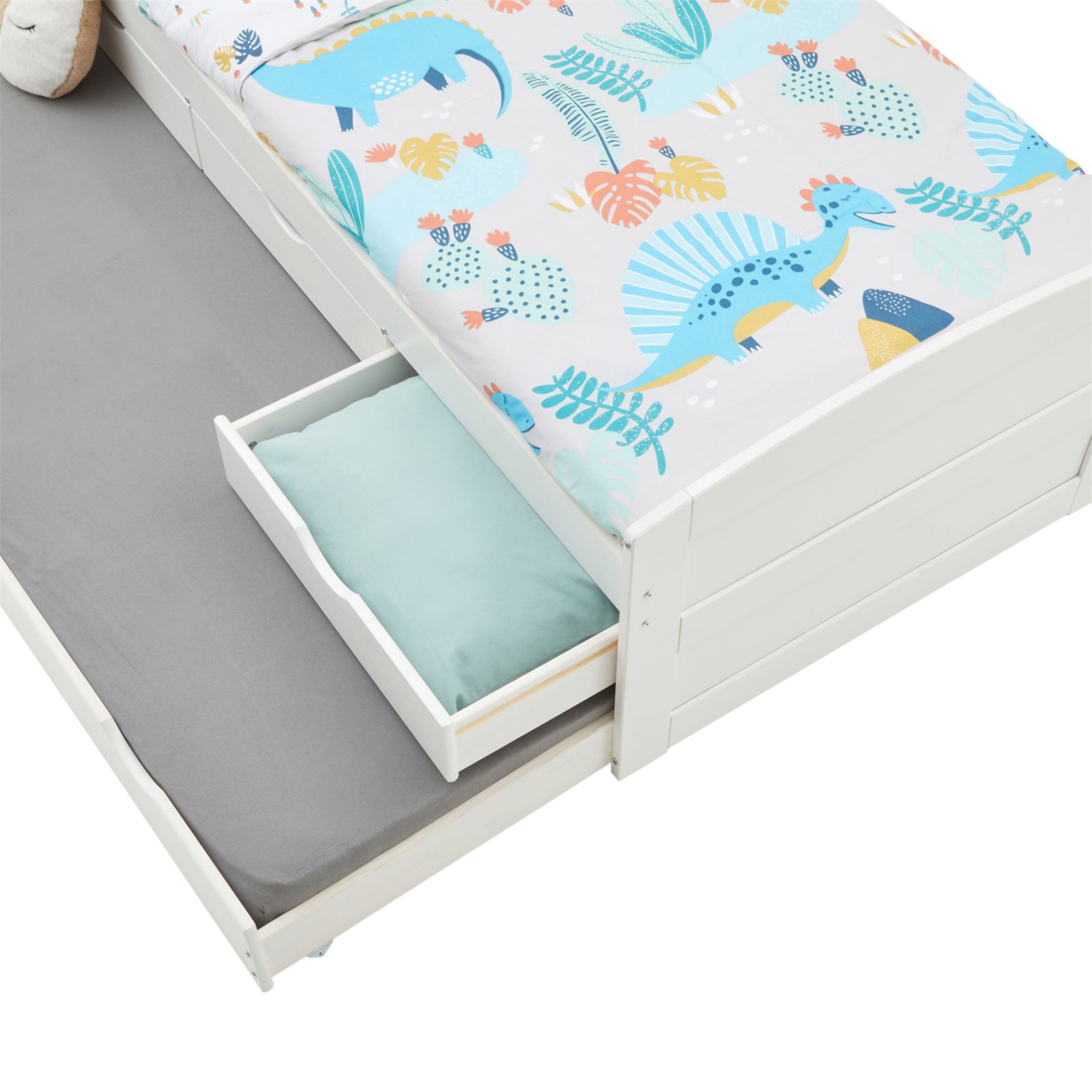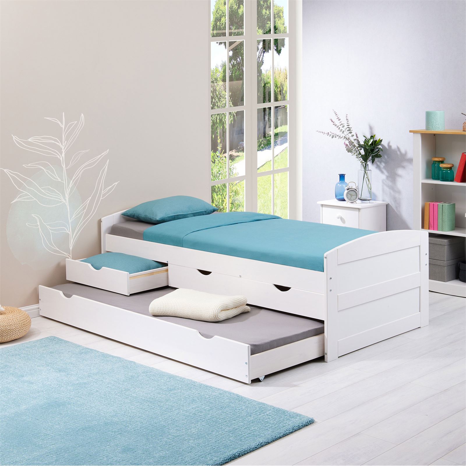 | Libellé | Lit gigogne JESSY lit enfant fonctionnel avec tiroir-lit et rangement 3 tiroirs, couchage 90x190 cm, en pin massif lasuré blanc |
