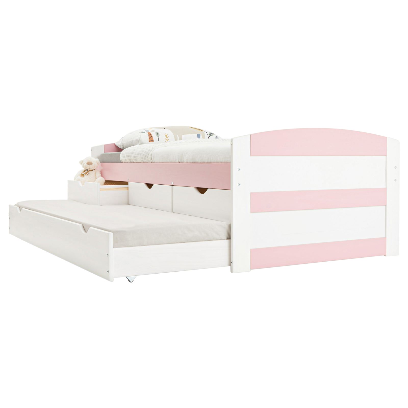 | Libellé | Lit gigogne JESSY lit enfant fonctionnel avec tiroir-lit et rangement 3 tiroirs, couchage 90x190 cm, en pin massif lasuré blanc/rose |